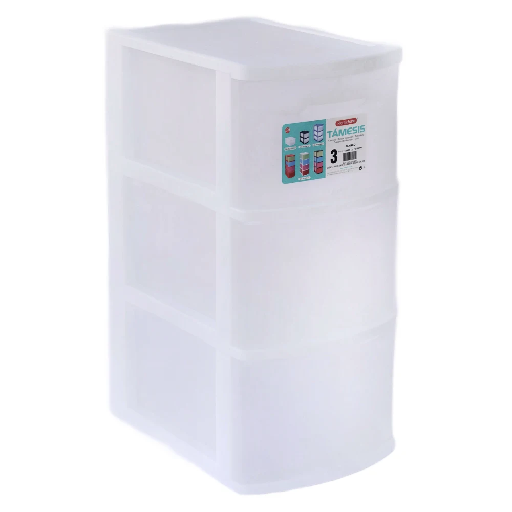 PLASTIC FORTE TAMESIS 3 LAYER STORAGE DRAWERS The Plastic Forte Tamesis 3 Layer Storage Drawers is a lightweight, 3-drawer organizer made of durable plastic. It's ideal for storing small items like office supplies, clothes, or toys. The unit is compact, stackable, and easy to use, making it a great solution for home or office organization.