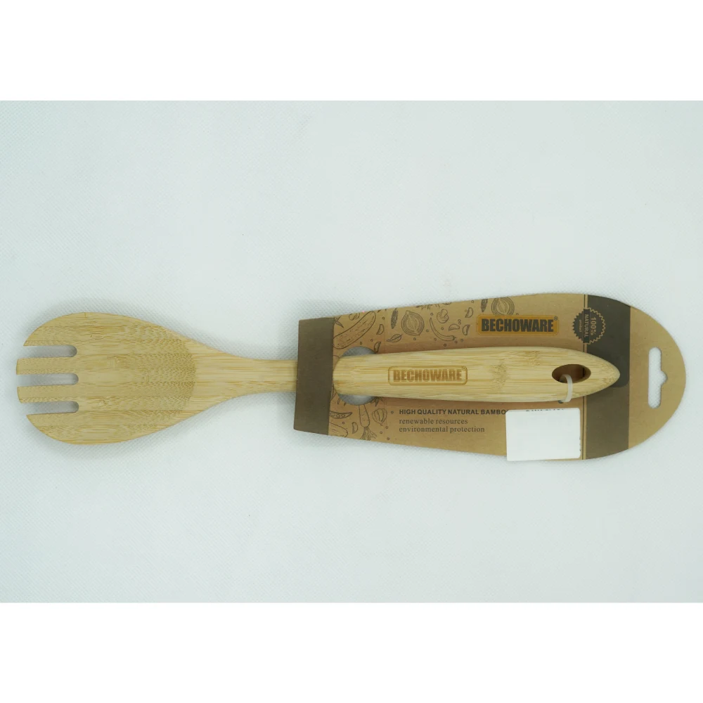 BECHOWARE BAMBOO SERVING FORK SPOON The Bechoware bamboo serving fork spoon is a versatile kitchen tool perfect for serving a variety of dishes. Made from eco-friendly bamboo, it combines durability with a lightweight design, making it easy to handle. The forked end is great for lifting and serving items like salads, pasta, or grilled vegetables, while the spoon end is perfect for scooping. Its natural finish adds a touch of elegance to your table setting, and the bamboo material is gentle on cookware, making it suitable for non-stick surfaces. This serving fork spoon is a stylish and practical addition to any kitchen or dining experience.