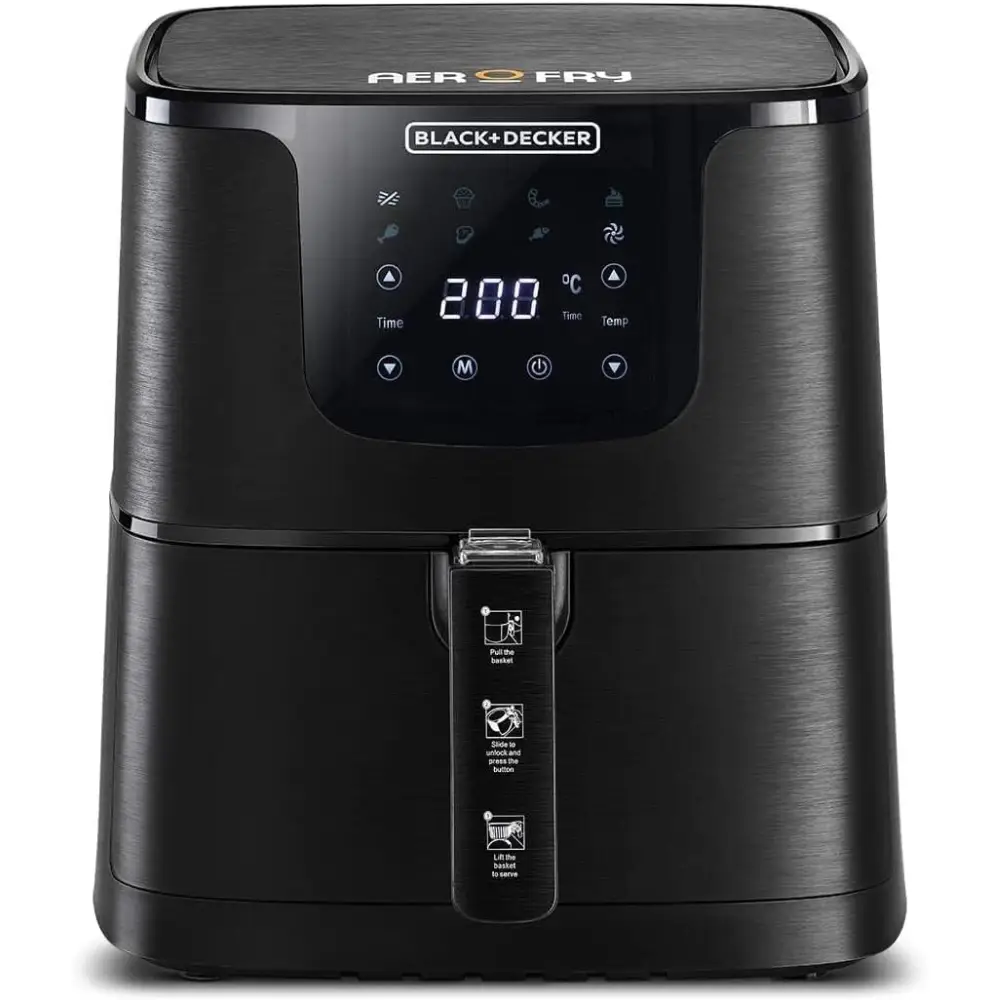 BLACK + DECKER 5.8 L AEROFRY ADVANTAGE AIR FRYER 1700 W AF700-B5 This Air Fryer offers the following features: Powerful: Digital temperature control (80-200°C) for perfect cooking results. Large Capacity: 5.8L capacity, ideal for cooking large portions. Modern Design: Premium brushed matte finish that fits into any modern kitchen. Convenient: 7 pre-set modes for easy cooking. Efficient: Touch control with an LED display for quick and easy selection.