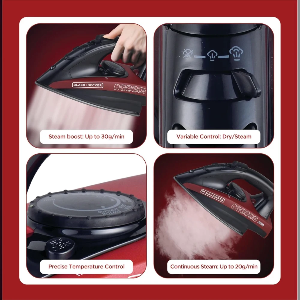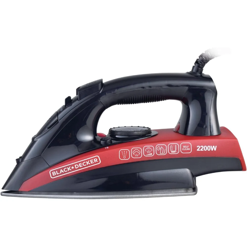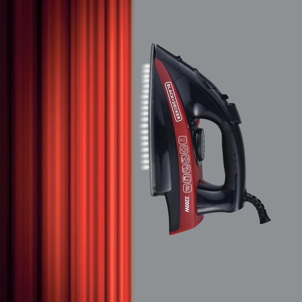 BLACK+DECKER X2200-B5 STEAM IRON 2200 W Powerful 2200 Watts: Ensures fast heating and efficient steam production for quick wrinkle removal. Self-Cleaning Function: Helps to maintain the iron by automatically cleaning the internal parts, reducing mineral buildup Steam Boost: Offers a steam boost of up to 30g/min, providing extra steam power for tackling stubborn wrinkles. Variable Control: Allows you to switch between dry and steam ironing, giving you flexibility depending on the fabric type. Continuous Steam: Delivers consistent steam output of up to 20g/min for effective wrinkle removal during normal ironing. Non-Stick Soleplate: The soleplate is designed to glide smoothly over fabrics, reducing the risk of sticking or snagging. Efficient Ironing: The combination of high wattage and steam capabilities makes it easy to eliminate wrinkles quickly. Versatile Usage: Suitable for a range of fabrics, from delicate materials to heavier textiles 220ml water tank, 25 Steam holes