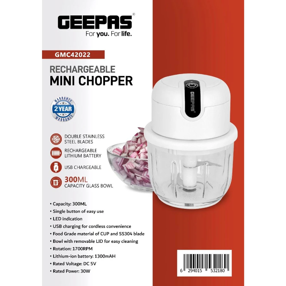 GEEPAS CHOPPER GMC - 42022 300ml Capacity Perfect for preparing a variety of ingredients. Single-Button Operation Simple and user-friendly design for easy use. LED Indication Provides clear feedback during operation. USB Charging Enjoy cordless convenience with easy USB charging. Food-Grade Materials Constructed from safe food-grade materials for the cup and SS304 blade. Removable Lid Bowl features a removable lid for effortless cleaning. Rotation Speed Operates at 1700 RPM for efficient blending. Battery Specs Lithium-ion battery with a capacity of 1300mAh. Rated Voltage DC 5V for optimal performance. Rated Power 30W for reliable operation