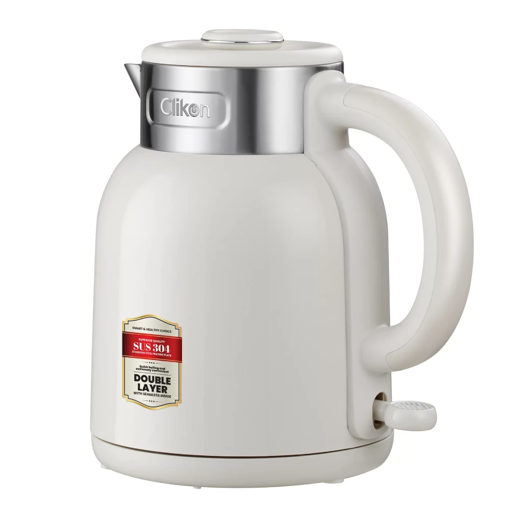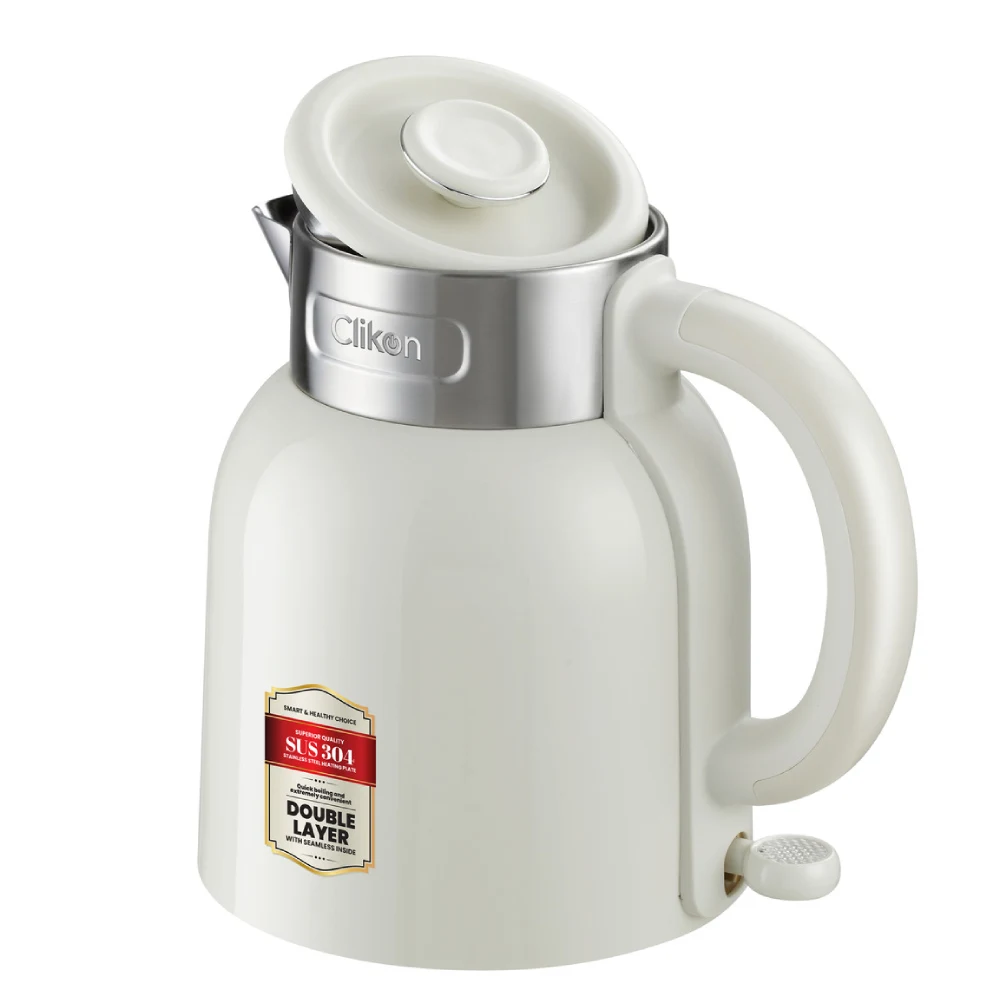 CLIKON DOUBLE LAYER WITH SEAMLESS INSIDE ELECTRIC KETTLE CK5149 1600 W Double Layer Design: The double-layer construction helps to keep the outer surface cool while the inner layer heats up, providing added safety and comfort during use. Capacity: With a 1.5-liter capacity, it’s suitable for preparing enough water for tea, coffee, or cooking for multiple people. Stainless Steel Heating Plate: The stainless steel heating element ensures efficient heat conduction, allowing for faster boiling and improved durability. Boil-Dry Protection: This safety feature automatically shuts off the kettle if it detects that there is no water inside, preventing overheating and potential damage. Easy to Use: Typically features a simple on/off switch and may include a water level indicator for easy monitoring. Cordless Design: Many models have a cordless design with a 360-degree swivel base, making it easy to lift and pour without being tethered to a power source. AC: 220-240 V, 50/60 HZ DIMENSIONS: 20.5 X 16.5 X 21.5 CM