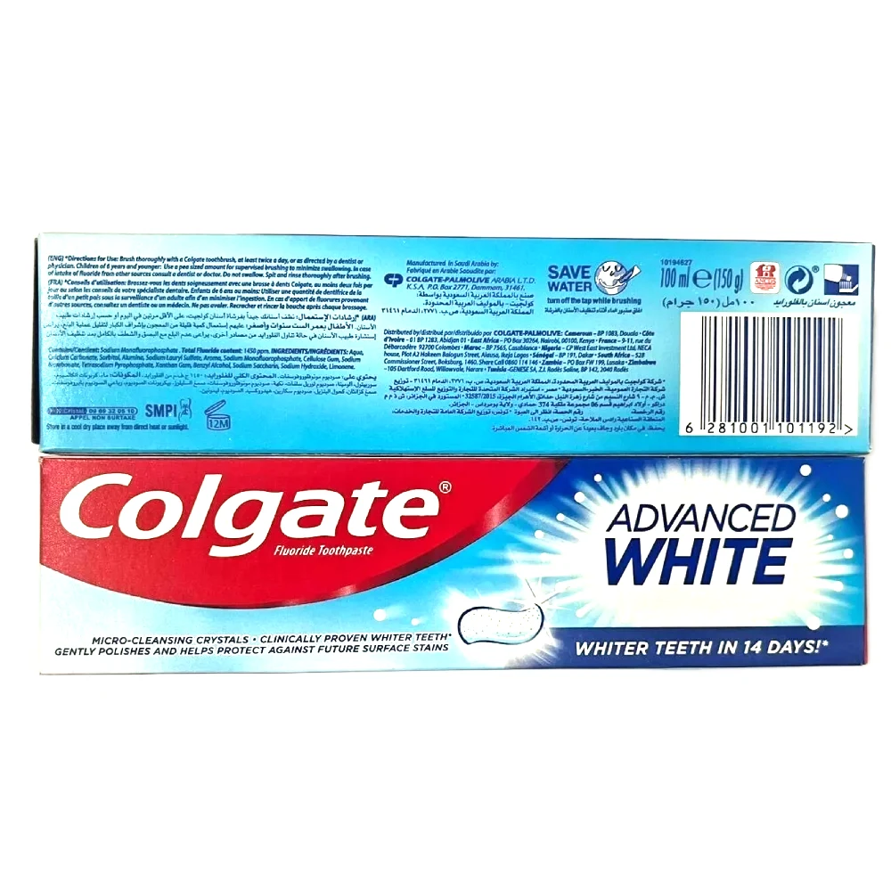COLGATE ADVANCED WHITE FLUORIDE TOOTHPASTE 150 G Colgate Advanced White Fluoride Toothpaste (150 g) is designed for those looking to enhance their oral care routine with a focus on whitening and cavity protection. Here are some key features: Key Features: Whitening Formula: Helps remove surface stains for a brighter smile and whiter teeth. Fluoride Protection: Contains fluoride to strengthen enamel and protect against cavities. Plaque Removal: Effectively fights plaque buildup for improved gum health. Fresh Breath: Leaves your mouth feeling fresh and clean with a refreshing flavor. Daily Use: Suitable for everyday use to maintain optimal oral hygiene.