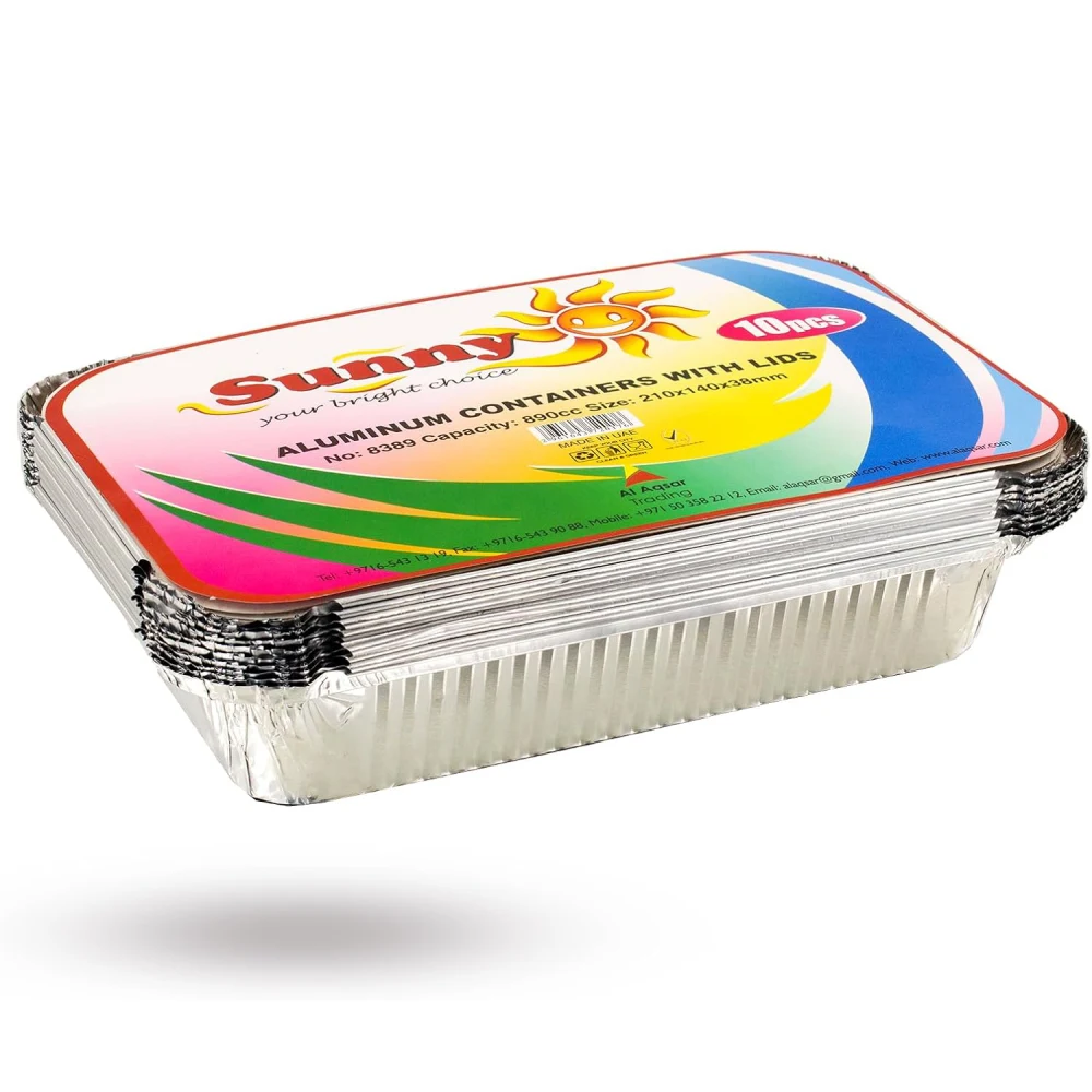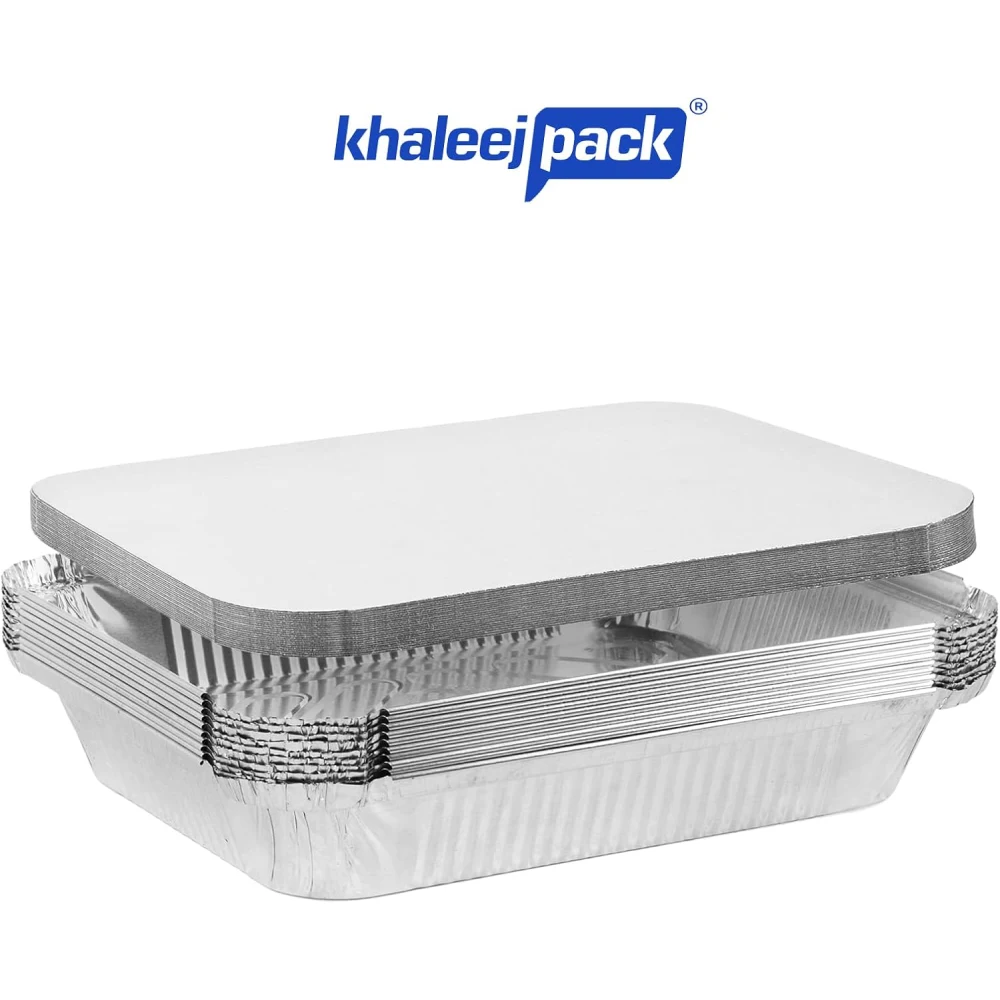 KHALEEJ PACK ALUMINIUM CONTAINER WITH LID VERSATILE 420 CC 10 PCS The Khaleej Pack aluminum container with lid, versatile 420 cc (cubic centimeters), typically comes in a pack of 10. These containers are designed for various food storage and takeaway needs. Key Features: Capacity: 420 cc, suitable for small to medium portion sizes. Material: Durable aluminum, often recyclable. Lids: Comes with secure-fitting lids to prevent leaks and spills. Quantity: Usually sold in packs of 10. Uses: Food Storage: Ideal for meal prep, leftovers, and packing lunches. Takeaway: Perfect for restaurants and catering services. Baking: Can be used for oven-safe cooking (ensure lids are removed during baking). Benefits: Lightweight: Easy to stack and transport. Heat Retention: Keeps food warm for longer. Versatile: Suitable for a variety of foods, from salads to baked dishes