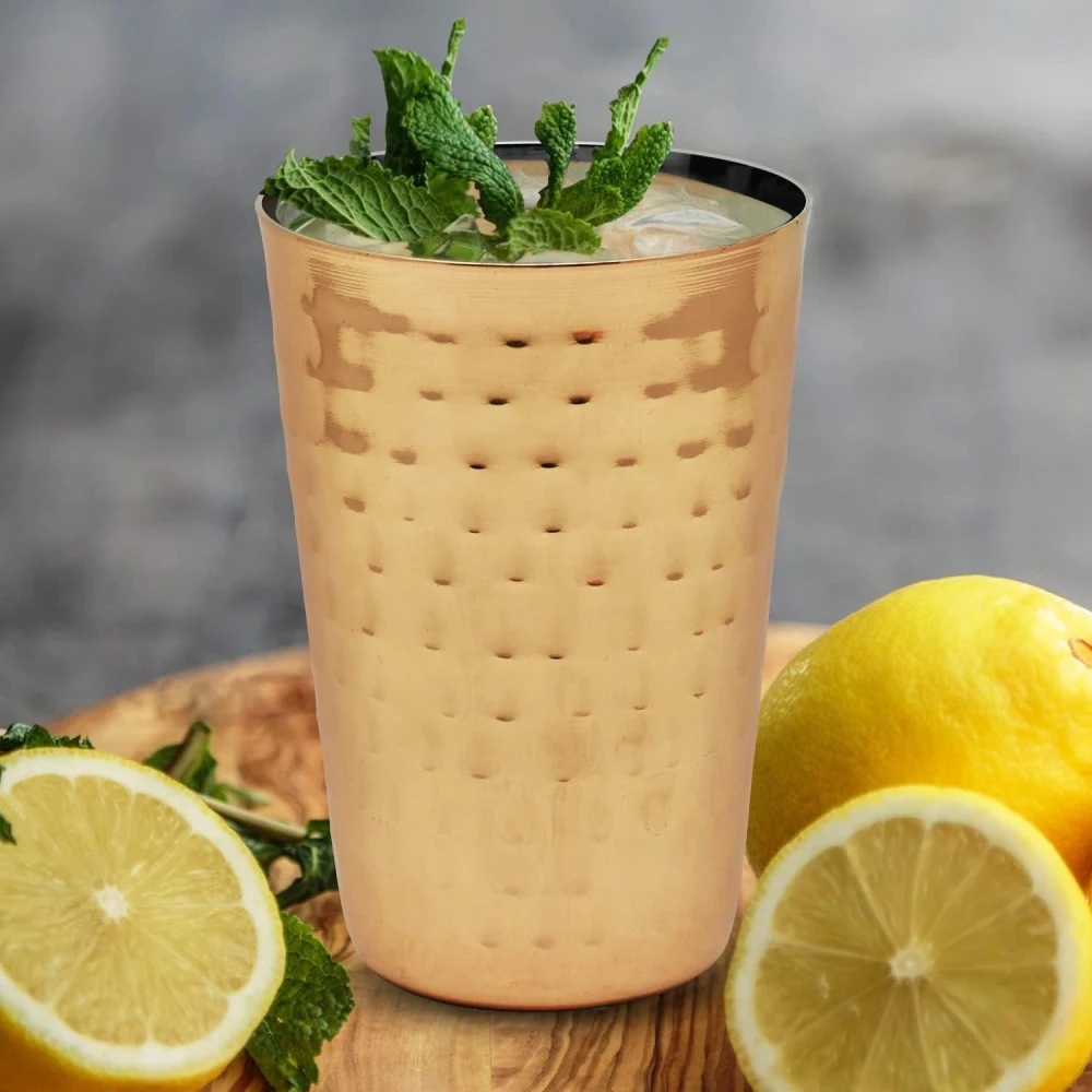 RAJ COPPER DRINKING GLASS 8 CM its uses and care: Uses: Traditional Beverages: Perfect for serving drinks like water, buttermilk, or traditional Indian beverages such as lassi. Cocktails: Great for serving cocktails, adding a rustic touch to your drinks. Chilled Beverages: Copper helps keep drinks cool, making it ideal for chilled beverages. Care Tips: Cleaning: Hand wash with mild soap and a soft sponge; avoid the dishwasher to preserve the finish. Drying: Make sure to dry thoroughly to prevent tarnishing. Polishing: Use a mixture of lemon juice and salt or a dedicated copper cleaner to maintain its shine.
