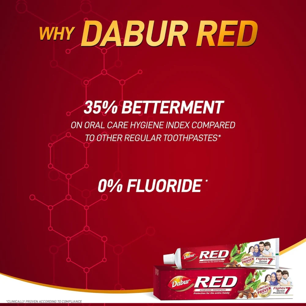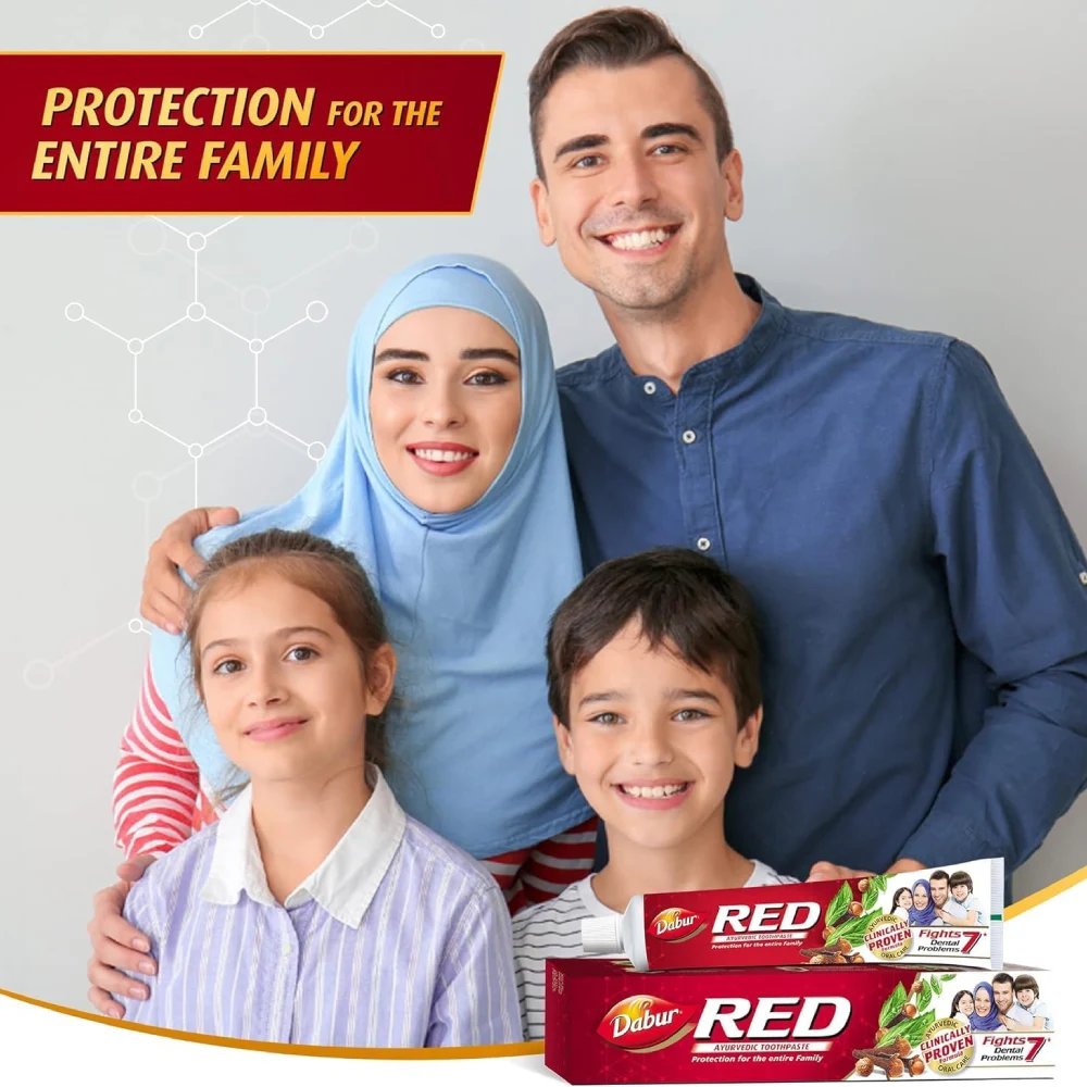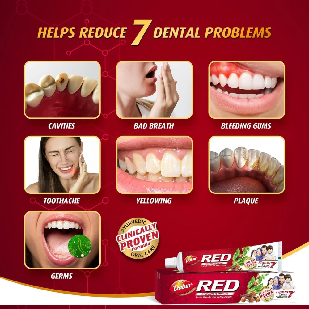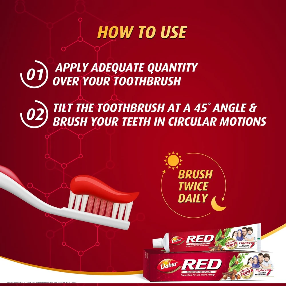 DABUR RED AYURVEDIC TOOTHPASTE 200 G Dabur Red Ayurvedic Toothpaste (200 g) is a popular choice for those seeking a natural approach to oral care. Here are some key features: Key Features: Ayurvedic Formula: Combines traditional Ayurvedic ingredients like clove oil, mint, and other herbal extracts for holistic dental health. Effective Plaque Removal: Designed to help remove plaque and prevent cavities for healthier teeth and gums. Fresh Breath: Provides long-lasting freshness, helping to combat bad breath. Natural Ingredients: Free from artificial flavors and preservatives, promoting a natural oral care routine. Gentle on Gums: Formulated to be gentle while effectively cleaning, making it suitable for daily use.