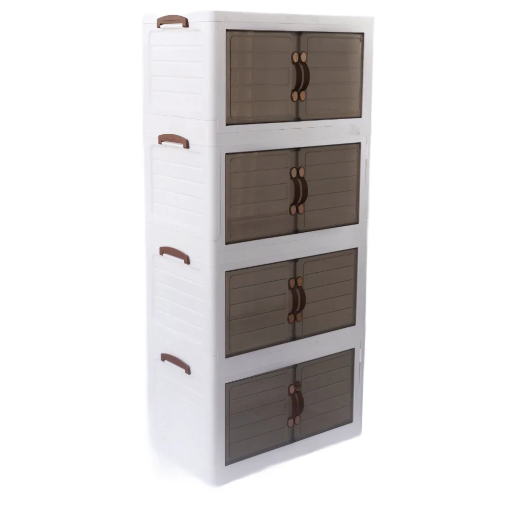DP 4 LAYER STACKABLE PLASTIC STORAGE CABINET WITH TRANSPARENT DOORS The DP 4-Layer Stackable Plastic Storage Cabinet with Transparent Doors (56 cm) is a practical and efficient storage solution for organizing your space. Key Features: 4 Layers: Four tiers of storage for organizing a variety of items like clothes, books, toys, or office supplies. Transparent Doors: The transparent doors allow you to see the contents inside, making it easy to find what you need without opening every drawer. Stackable: Can be stacked to save space and create a customized storage system. Size: 56 cm wide, perfect for use in closets, offices, or small rooms. Benefits: Space-Saving: Ideal for smaller spaces or rooms with limited storage. Convenient: Transparent doors make it easy to identify items. Organized: Keeps your belongings neatly stored and easily accessible. Durable: Made from sturdy plastic for long-lasting use.