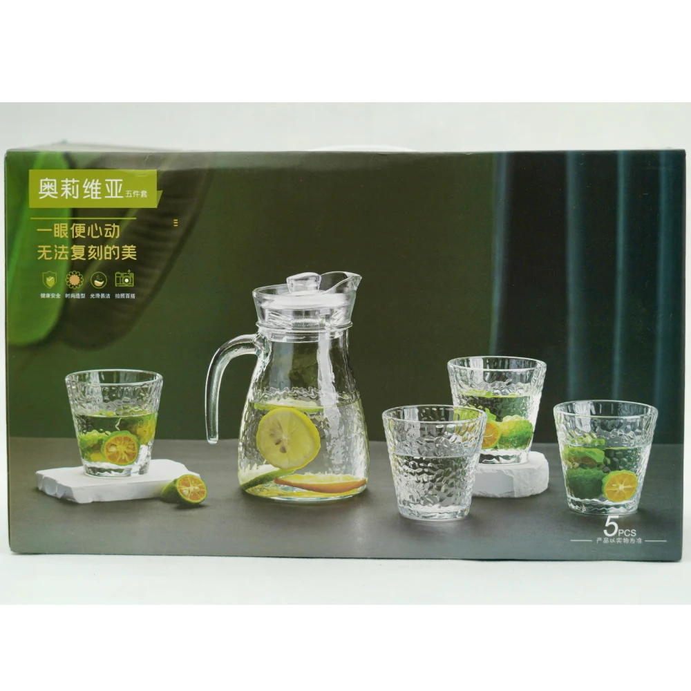 DP GLASS WARE SET 5 PIECES The DP Glassware Set typically includes 5 pieces, designed for both functionality and style. This set often features: 1 pitcher: Perfect for serving beverages like water, juice, or cocktails. 4 glasses: Usually matching in design, these are suitable for various drinks, from water to soft drinks. The glassware may be made from high-quality, durable glass, often with decorative elements like etching or colored accents. This set is ideal for entertaining guests or adding a touch of elegance to your dining experience.