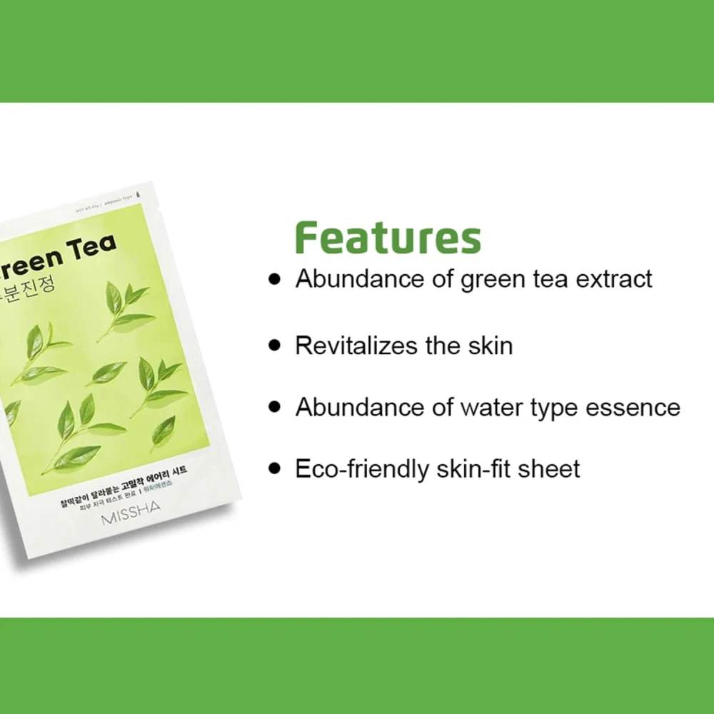MISSHA GREEN TEA AIRY FIT SHEET MASK 19 G The green tea extract and other hydrating ingredients work together to provide long-lasting moisture to dry or parched skin. The mask is ideal for restoring the skin’s moisture balance, especially in harsh climates or after a long day. Calms and Soothes Irritated Skin: Green tea’s anti-inflammatory properties help to calm and soothe irritated, red, or sensitive skin. It can reduce the feeling of tightness or discomfort often associated with dry skin or skin sensitivity. Antioxidant Protection: Green tea is rich in antioxidants, which help fight free radicals and protect your skin from environmental stressors like pollution, sun exposure, and harsh weather. This makes the mask a great choice for preventing premature aging and maintaining overall skin health. Balances and Revitalizes Skin: The mask works to restore balance to your skin by providing hydration without being greasy. It helps to give your skin a refreshed, revitalized