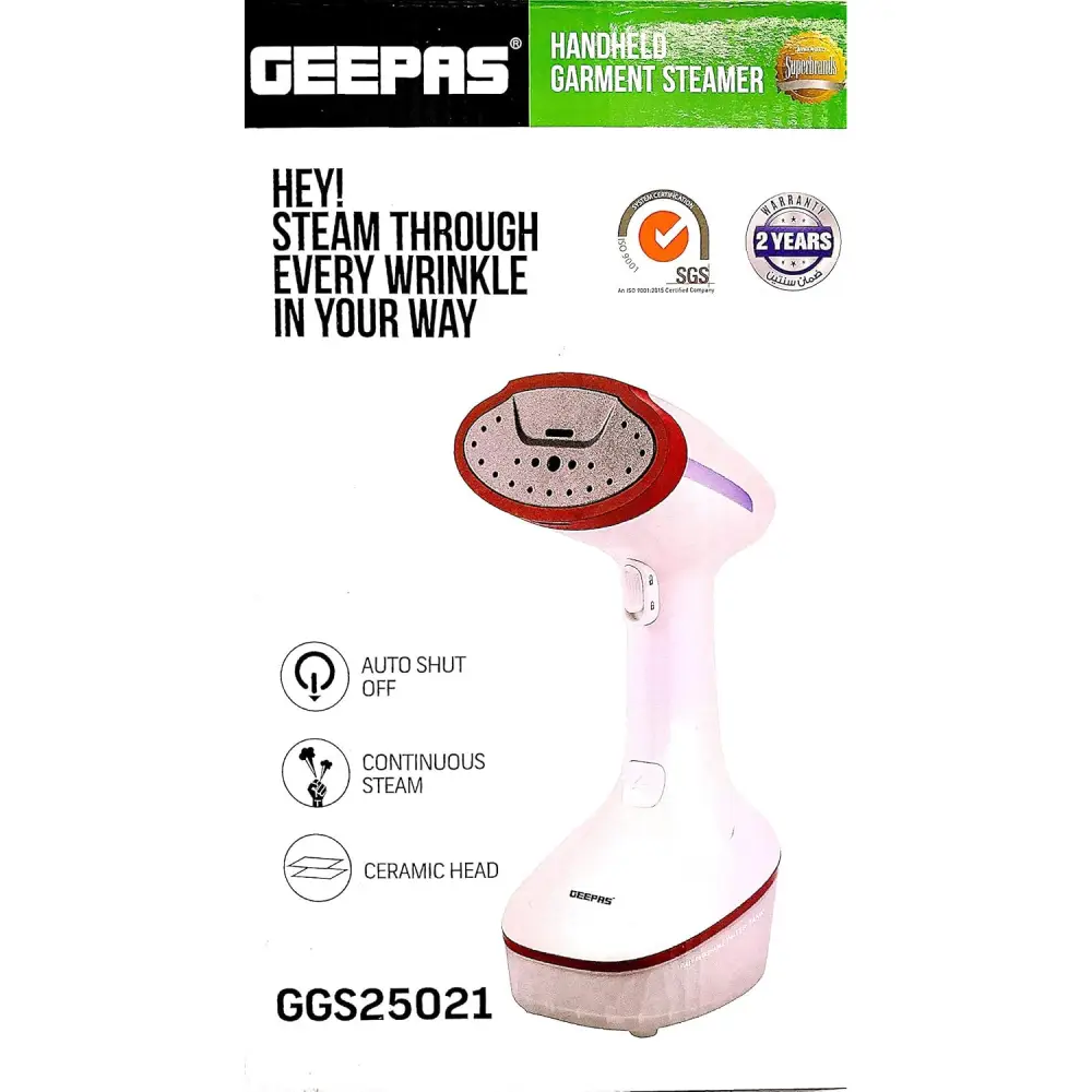 GEEPAS GARMENT STEAMER GGS25021 A good-quality handheld garment steamer with a ceramic head and a detachable water tank, The steamer produces continuous and adjustable steam to get your job done efficiently, The steamer has an auto-shutoff function and is suitable and safe for delicate and other types of fabrics, The steam intensity can be locked, which allows you to produce continuous steam flow without pressing the button for a long time, The handheld garment steamer is perfect for quick touch-ups on clothes or fabric, but can also be used for steaming bedding, upholstery, and curtains