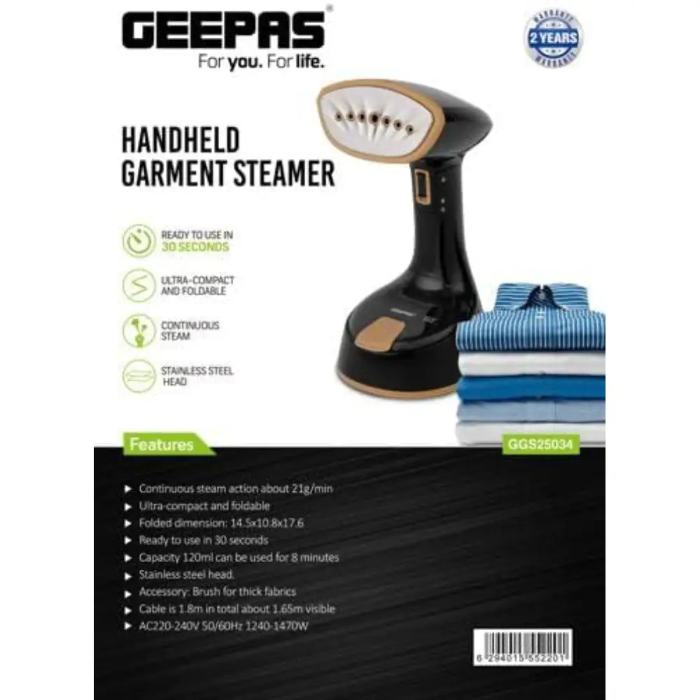 GEEPAS GARMENT STEAMER GGS25034 Getting rid of wrinkles is as easy as 1-2-3. With the Geepas handheld garment steamer, you can easily remove stubborn wrinkles and creases from your clothes and get the job done. Featuring a stainless steel head, the black and golden handheld garment steamer allows you to accomplish the job efficiently and reduce the chance of damage. This simplifies your daily chores. Additionally, the stainless steel head resists corrosion. This provides you with a safe and effective way to freshen up your clothing and other items for a long time. It has an ergonomic grip that provides safe and comfortable use without overheating and produces the best results. The handheld steamer has continuous steam flow with a stainless steel head for continuous steam action for about 21 g/min. The handheld garment steamer is ready to use in 30 seconds and can steam a variety of fabrics, even delicate ones. The ultra-compact and foldable design makes it very convenient to operate and carry around.