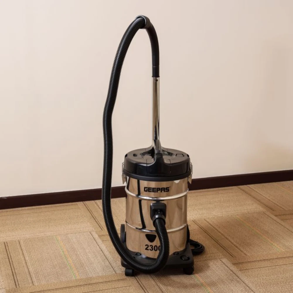 GEEPAS STAINLESS STEEL DRUM VACUUM CLEANER 2300 W 23 LITRE CAPACITY GVC2597N The Geepas GVC2597N Stainless Steel Drum Vacuum Cleaner is a powerful and efficient cleaning solution. Here are its key features: High Power Motor: The 2300W motor provides strong suction, making it effective for deep cleaning various surfaces, from carpets to hard floors. Stainless Steel Drum: The 23-liter capacity drum is durable and resistant to rust, ensuring longevity and ease of maintenance. Versatile Cleaning Tools: Comes with a range of attachments, including crevice tools and brushes, allowing for flexible cleaning in tight spaces and different surfaces. Effective Filtration System: Designed to capture dust and allergens, contributing to improved indoor air quality while you clean. User-Friendly Features: Includes wheels for easy maneuverability, ergonomic handles for comfortable carrying, and a long power cord for extended reach. AC: 220-240V 50/60Hz 2300W