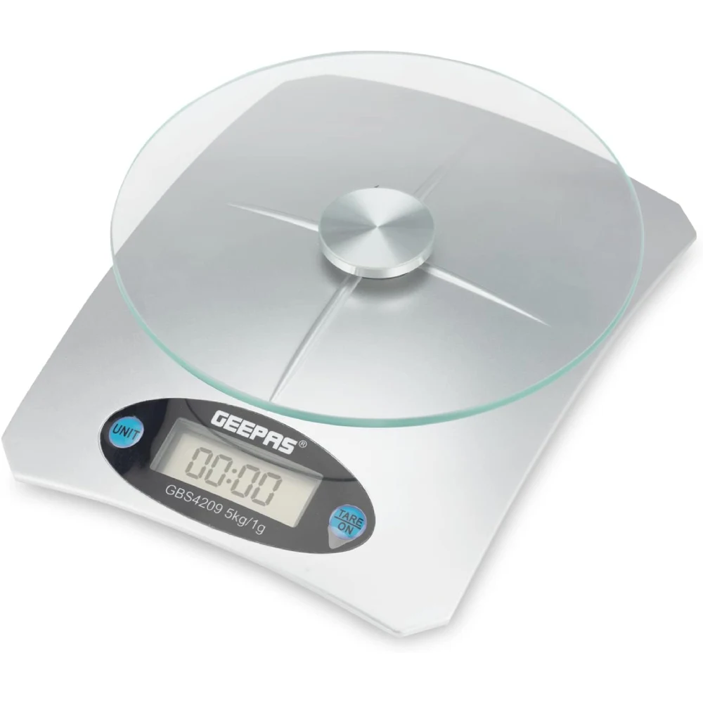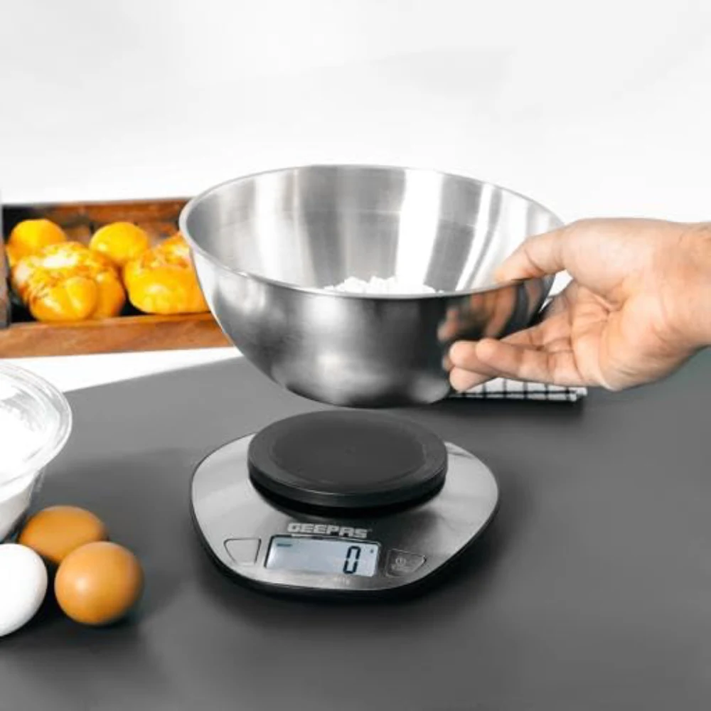 GEEPAS STAINLESS STEEL KITCHEN SCALE GKS4203N Units of measure: g- kg-lb:oz- water ml-water floz- milk ml-milk floz, Capacity: 5000g x lg - 111b x 0.10z, Display: White backlight LCD display, LCD size: 60 x 27.5 crn easy to read, Battery : 2x1.5V AAA battery (Not included), Automatic switch off after 2 minutes, Aquatronic function, Scales are a perfect substitute for a measuring jug.