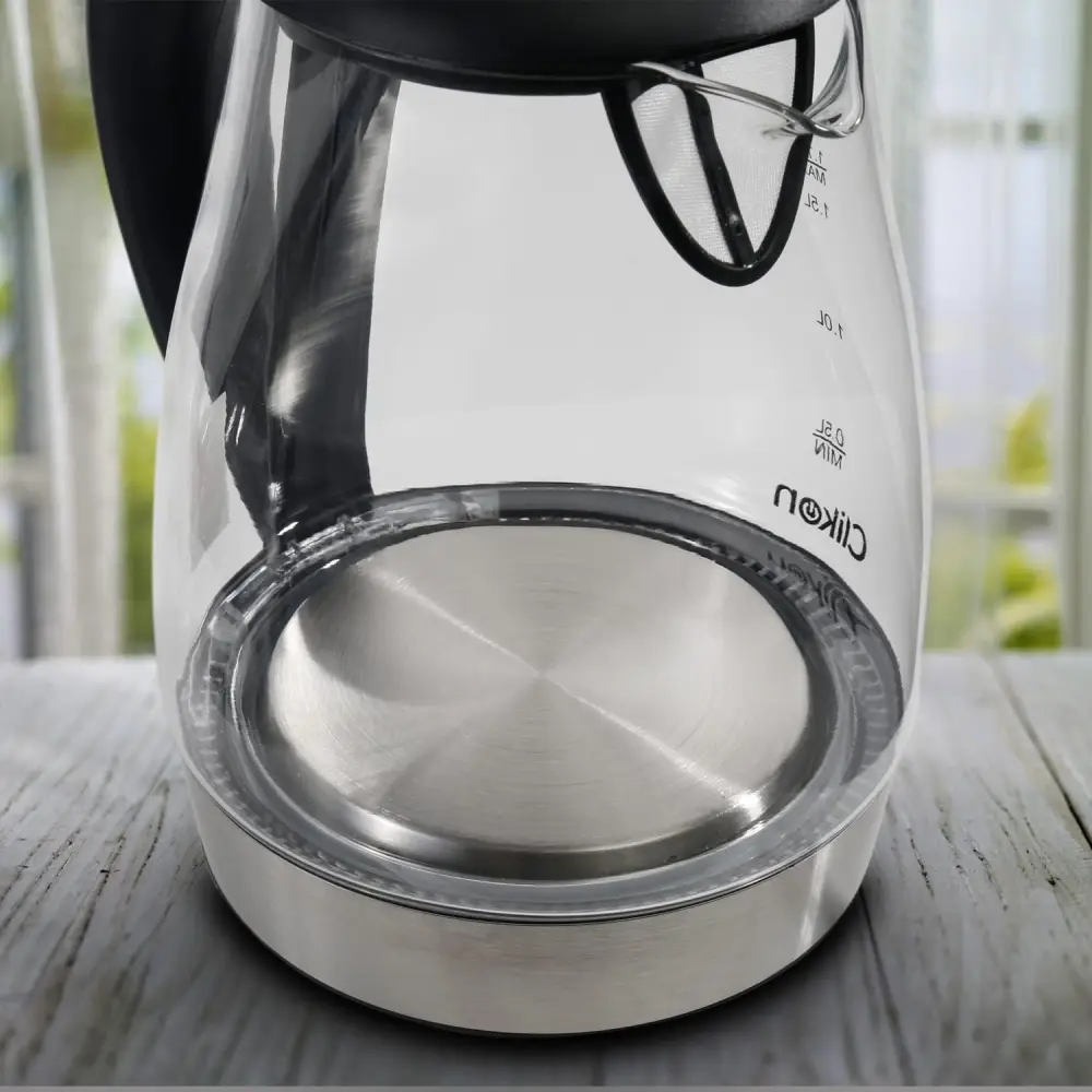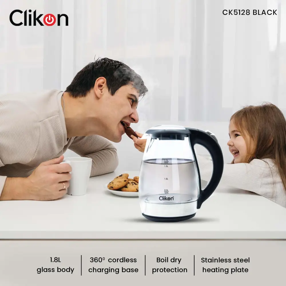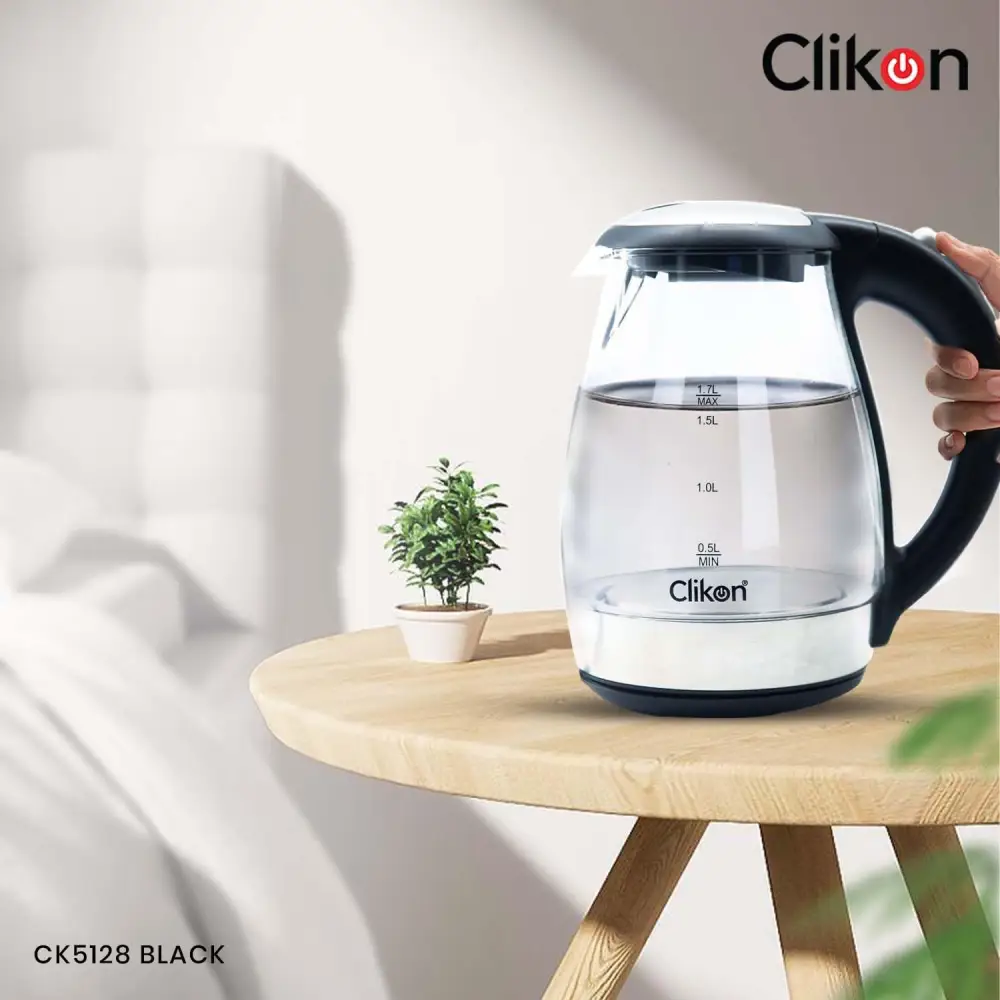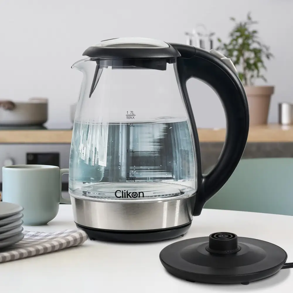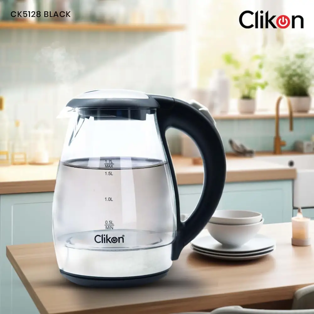 CLIKON GLASS KETTLE CK5128 1.7 Litre Glass Body Cordless Electric Kettle with a power capacity of 2200 Watts, Stainless Steel heating plate with LED light indicator, Smart power cut-off technology, Boil dry and overheat protection, 360° swivel cordless charging base