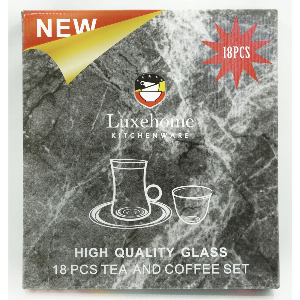 LUXEHOME GLASSWARE SET 18 PCS The LuxeHome Glassware Set with 18 pieces that includes saucers typically consists of a combination of elegant glassware, perfect for a variety of beverages and occasions. Here’s a breakdown of what you might find in this set: Components: 6 Glass Cups: Ideal for coffee, tea, or other beverages. These cups are usually designed with elegance and may feature decorative elements. 6 Matching Saucers: These saucers complement the cups, providing a refined touch and helping to catch spills or drips. 6 Additional Glasses: This could include tumblers or wine glasses, enhancing the set's versatility. Features: High-Quality Glass: Crafted from durable glass for clarity and strength, making it suitable for everyday use or special occasions. Elegant Design: Often features stylish designs, colors, or etchings that add sophistication to any table setting.