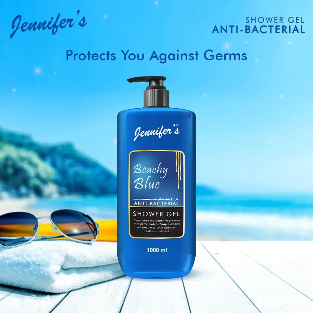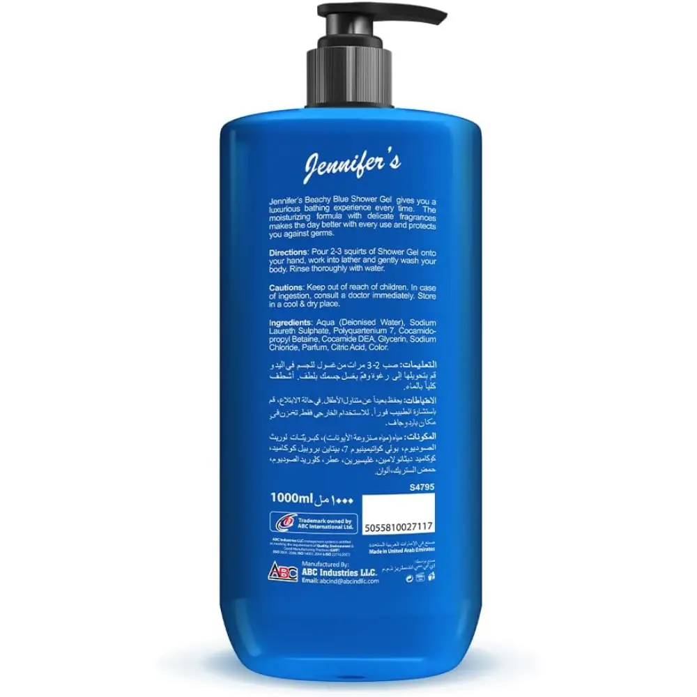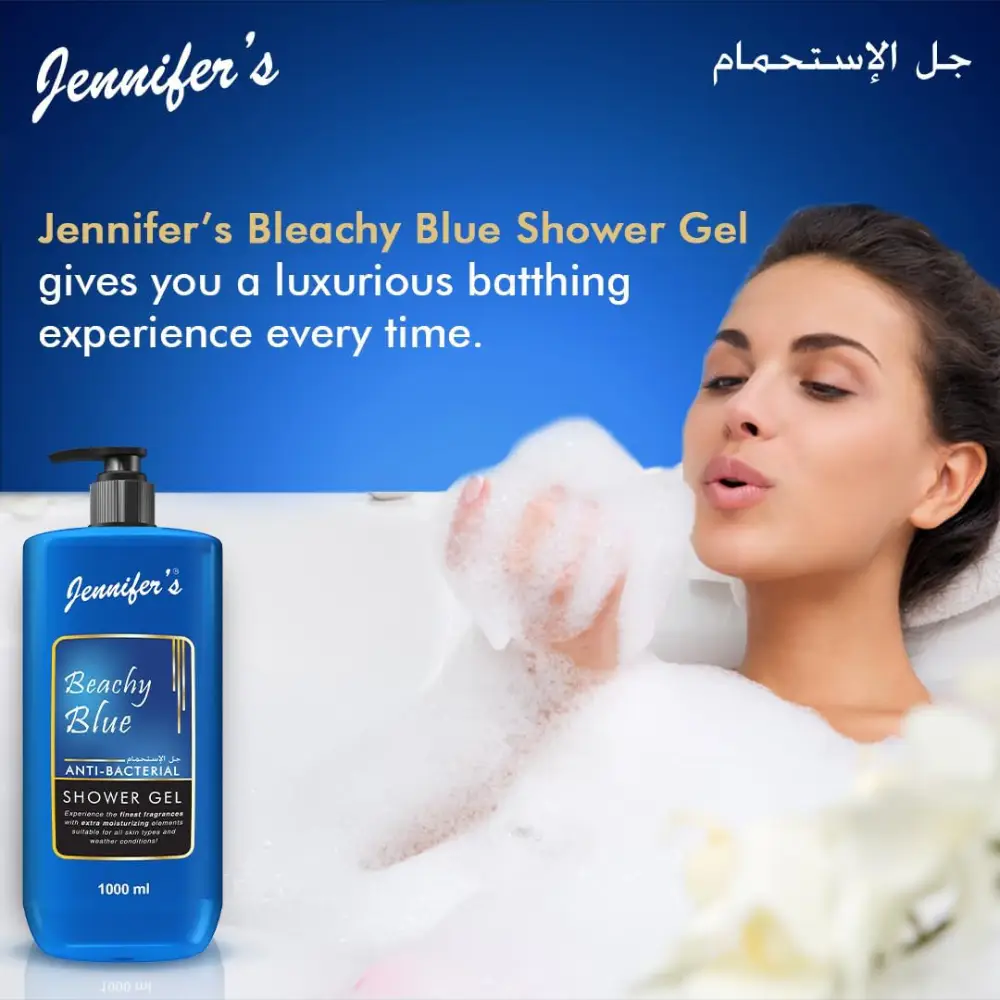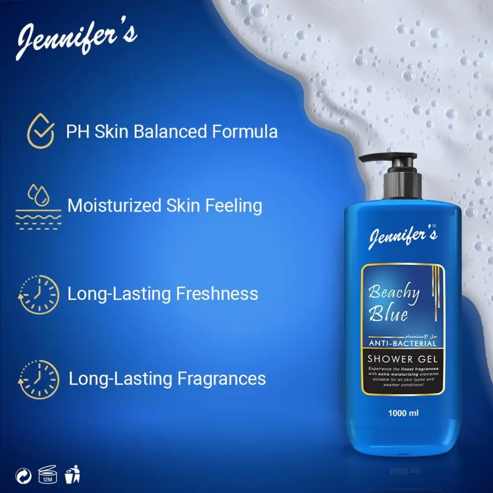 JENNIFERS BEACHY BLUE ANTI-BACTERIAL SHOWER GEL FOR ALL SKIN TYPES 1000 ML Anti-Bacterial Protection: Provides germ-fighting protection with each use, helping to keep your skin clean and safe. Extra Moisturizing: Moisturizing elements help to keep your skin hydrated and soft, preventing dryness. Suitable for All Skin Types: Gentle formula that works well for every skin type, including sensitive skin. Weather-Friendly: Designed to be effective in all weather conditions, ensuring your skin stays nourished and protected throughout the year. Refreshing & Soothing: Leaves your skin feeling refreshed, soothed, and invigorated after each shower. This makes the product a versatile and effective option for maintaining healthy, hydrated, and protected skin in various conditions.
