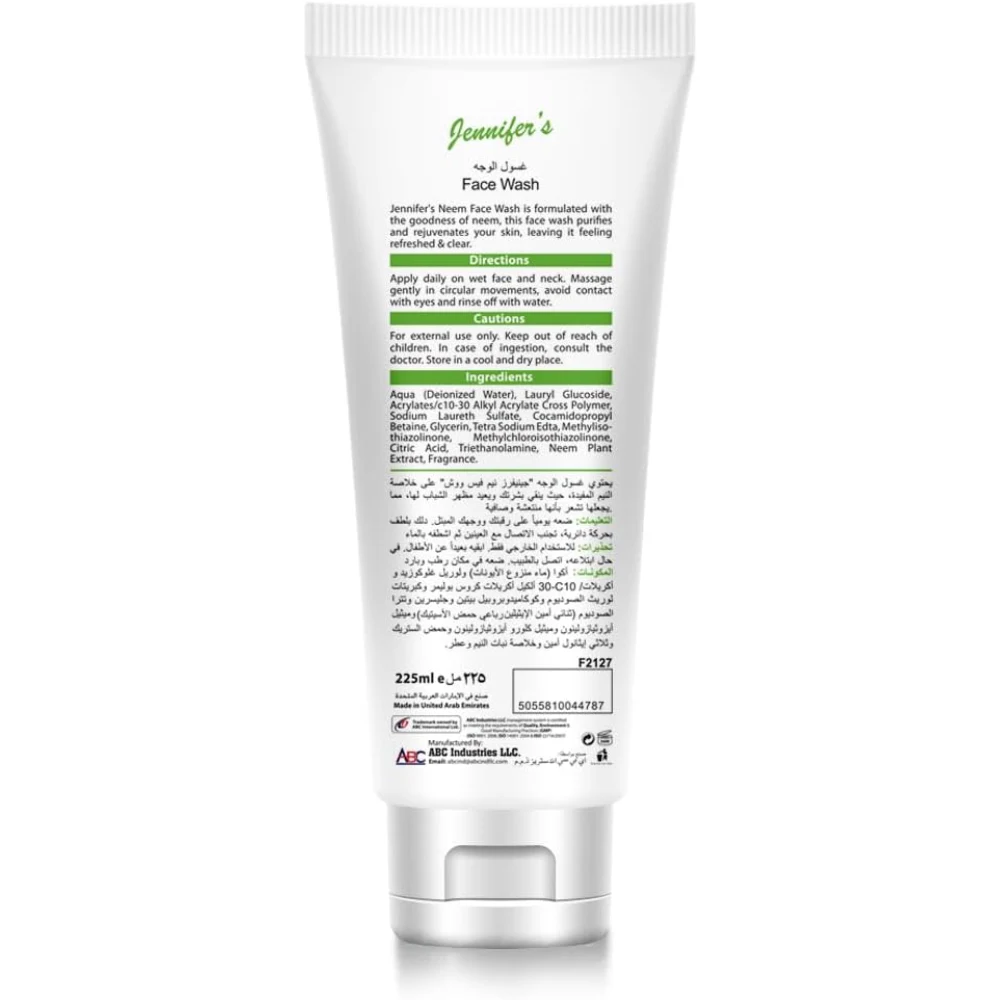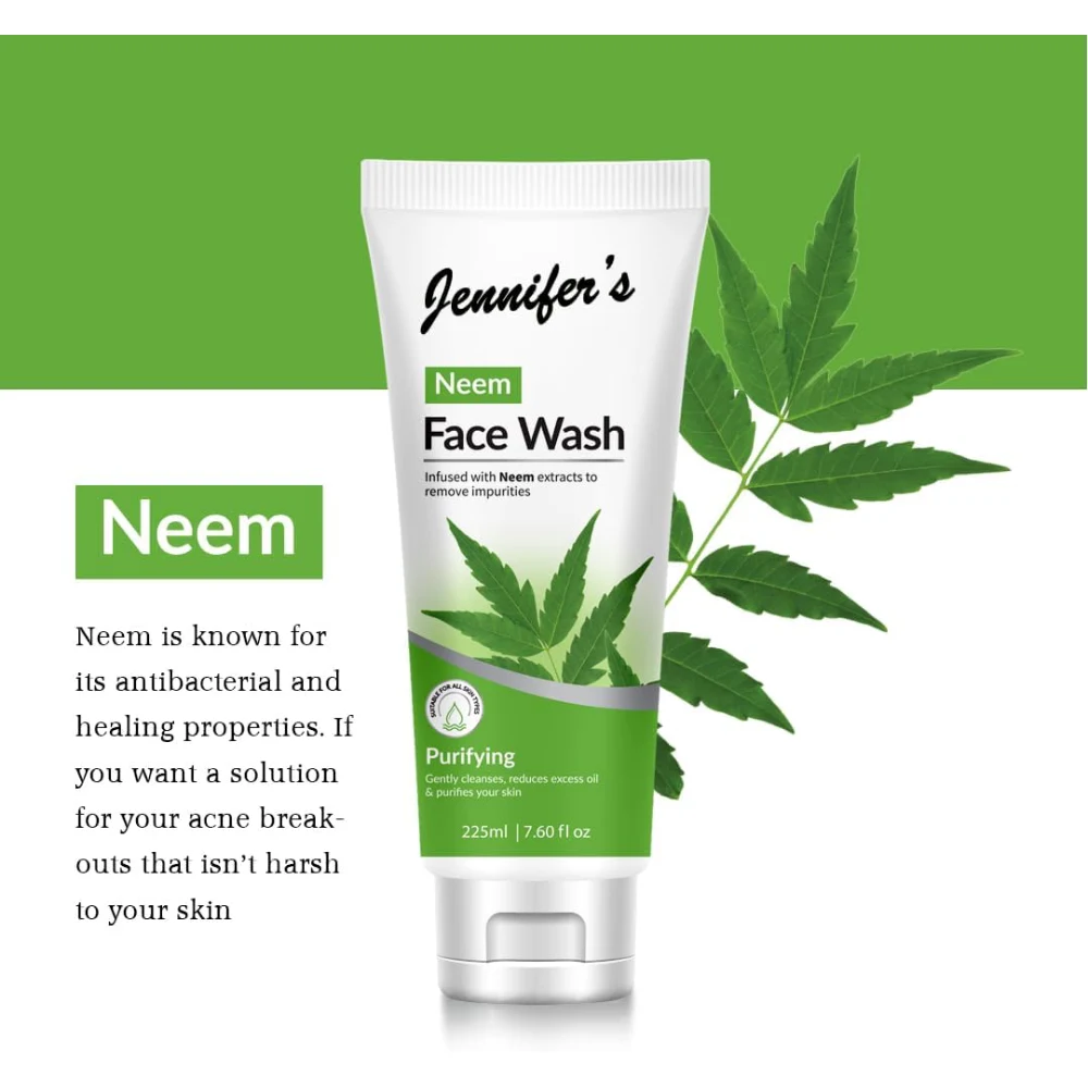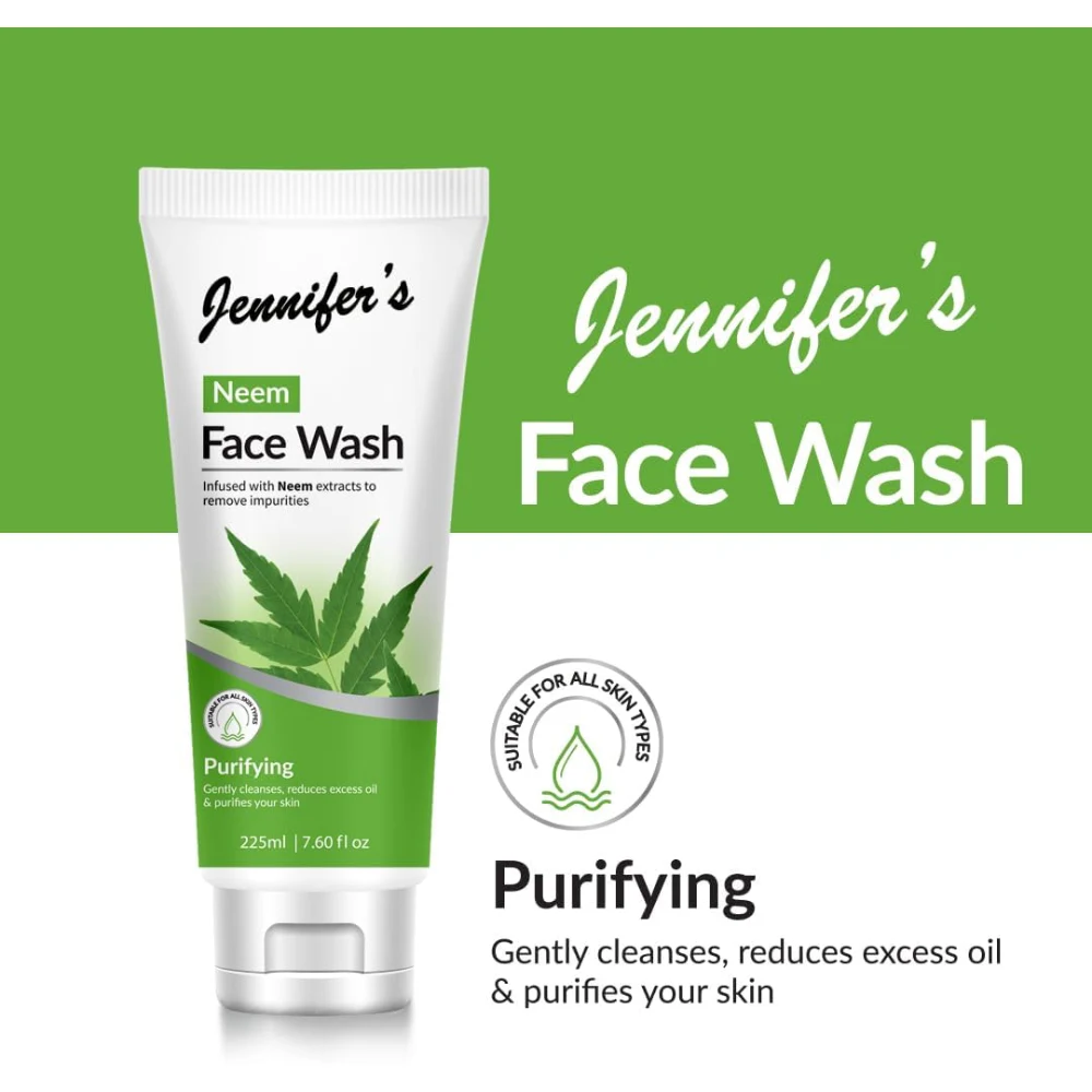 JENNIFERS NEEM FACE WASH PURIFYING GENTLY CLEANSES, REDUCES EXCESS OIL & PURIFIES YOUR SKIN 225 ML Jennifer's Neem Face Wash is formulated to provide a deep yet gentle cleanse, making it suitable for various skin types, especially oily and acne-prone skin. Here are some key features and benefits: Key Ingredients: Neem Extract: Known for its antibacterial and anti-inflammatory properties, neem helps fight acne and reduce redness. Natural Cleansers: Often contains herbal ingredients that help remove dirt and impurities without stripping the skin's natural moisture. Benefits: Deep Cleansing: Effectively removes makeup, excess oil, and impurities from the skin. Oil Control: Helps manage excess sebum production, making it ideal for oily skin types. Purifying Effect: Aids in preventing breakouts and promoting a clearer complexion. Gentle on Skin: Suitable for daily use, it cleanses without causing irritation or dryness. Usage: Wet your face with water.