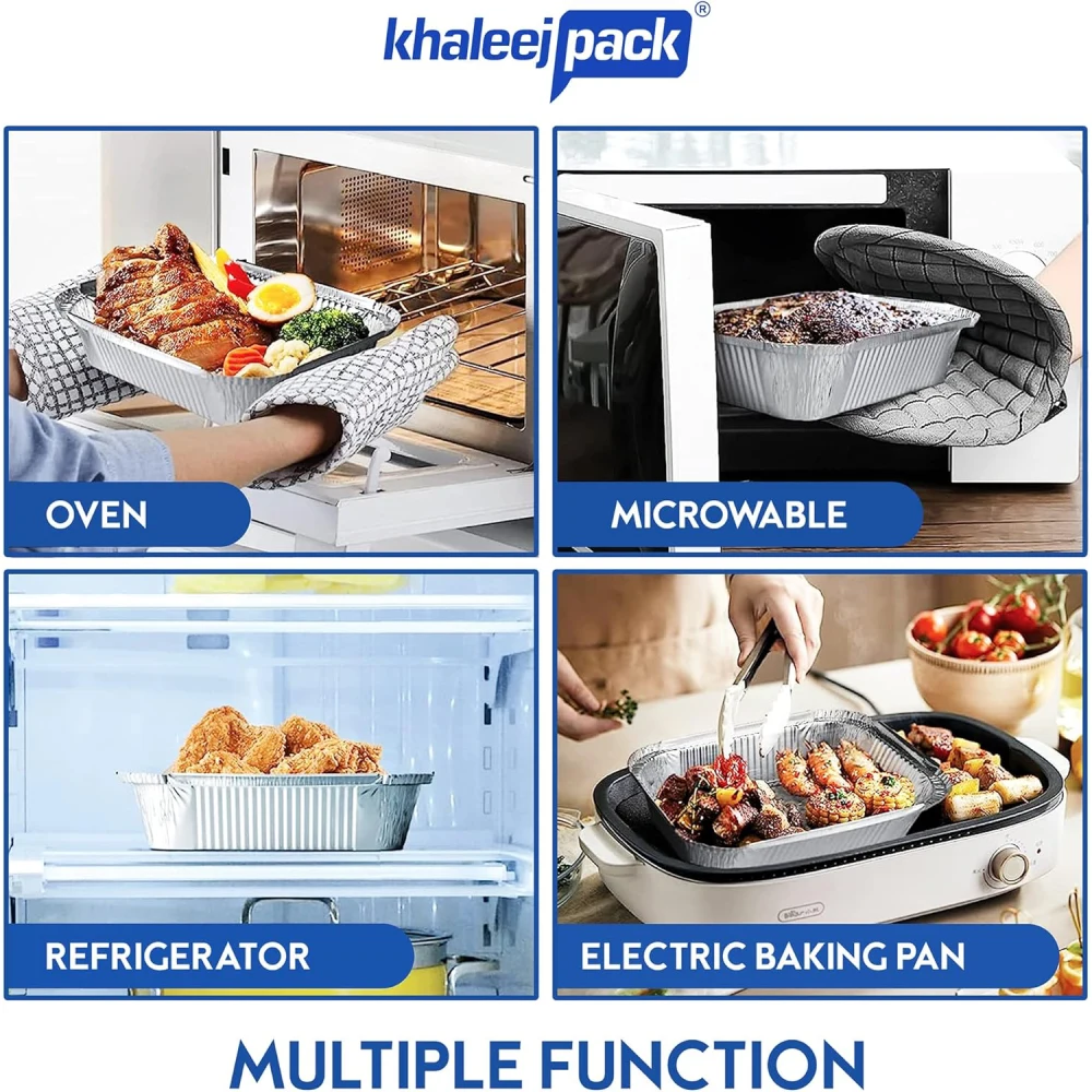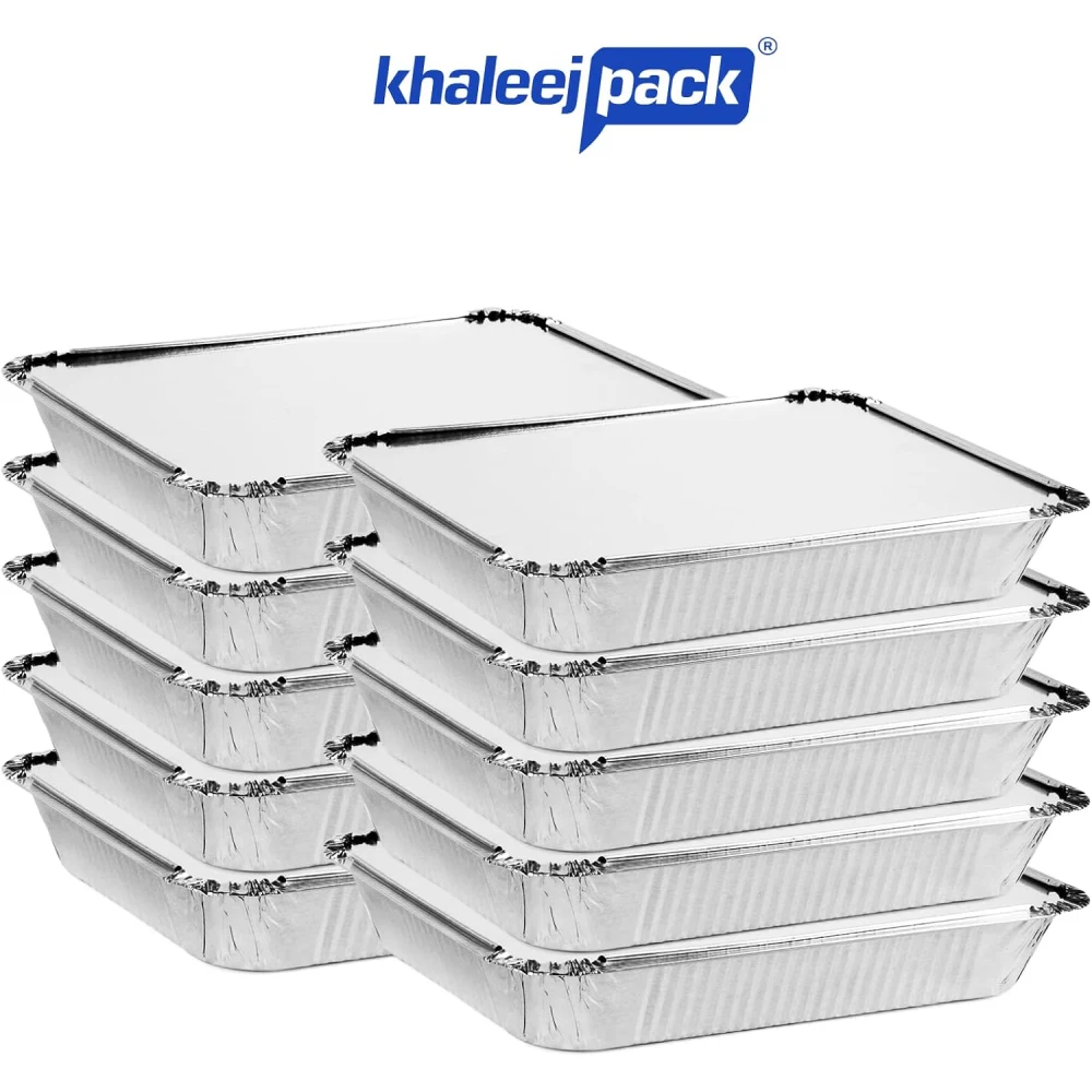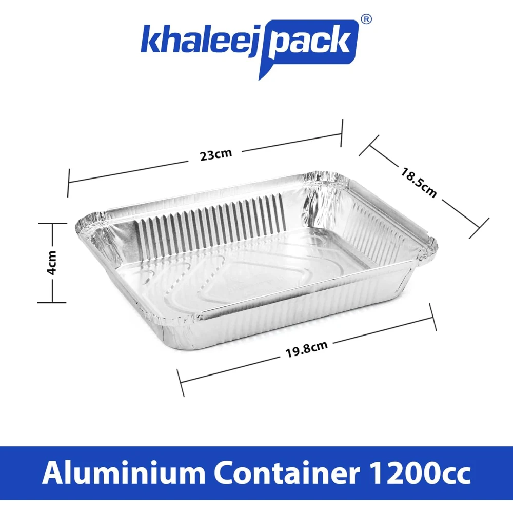 KHALEEJ PACK ALUMINIUM CONTAINER WITH LID 10 PCS/ 1200CC Khaleej Pack Aluminium Containers with Lids (10 pcs / 1200 cc) are convenient and versatile kitchen essentials. Here’s an overview of their key features and uses: Key Features Durable Material: Made from high-quality aluminium, these containers are sturdy and can withstand various cooking and storage conditions. Lid Included: Each container comes with a lid, making it easy to cover and store food securely. Generous Size: With a capacity of 1200 cc, these containers are perfect for storing larger portions of food, whether for leftovers, meal prep, or catering. Versatile Use: Suitable for cooking, baking, and storing a wide variety of foods, including casseroles, stews, and baked goods. Disposable Option: Ideal for events, picnics, or gatherings where easy cleanup is a priority. Uses Food Storage: Perfect for storing leftovers in the fridge or freezer. The lids help keep food fresh and prevent spills.