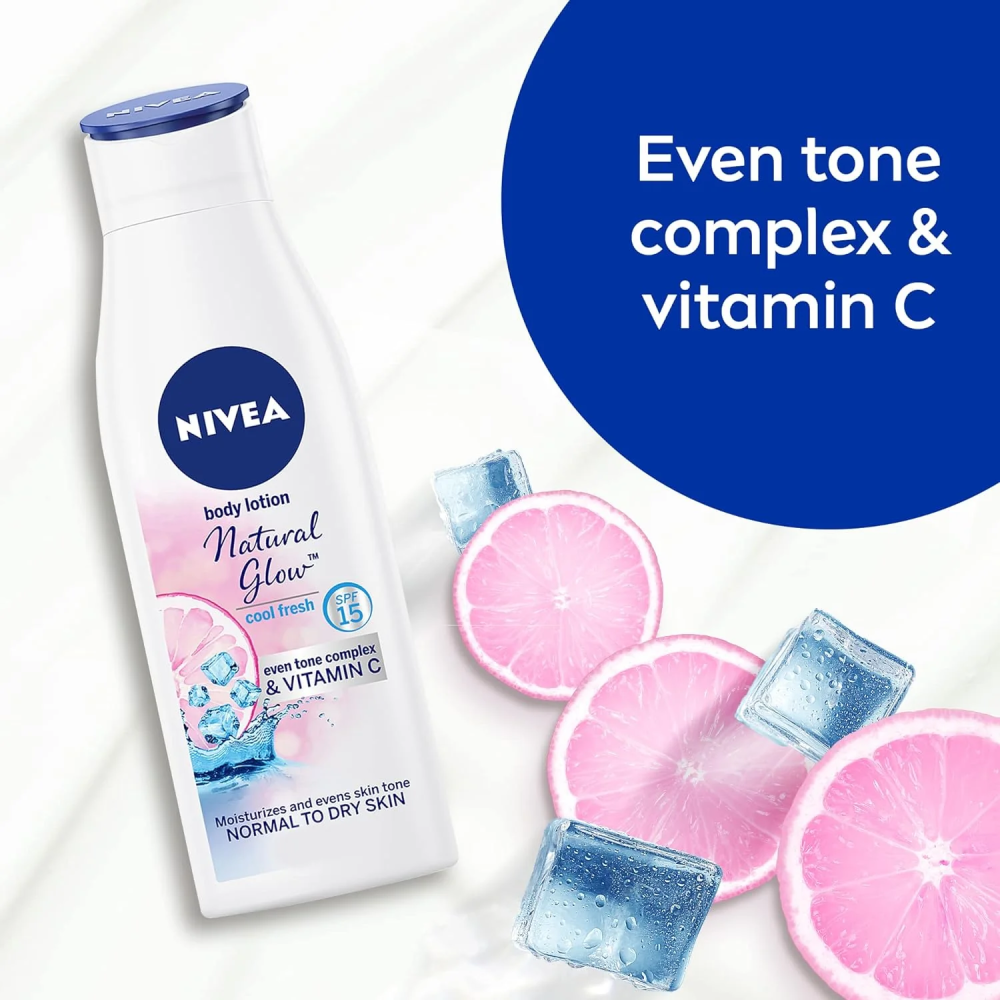 NIVEA NATURAL GLOW BODY LOTION 250ML This lightweight, non-greasy formula provides an instant cooling sensation. Enriched with vitamin C for an even skin tone and menthol extracts for a refreshing feel, it also contains UVA/UVB filters for protection against harmful sun rays with SPF 15. Suitable for normal to dry skin and dermatologically tested for compatibility.