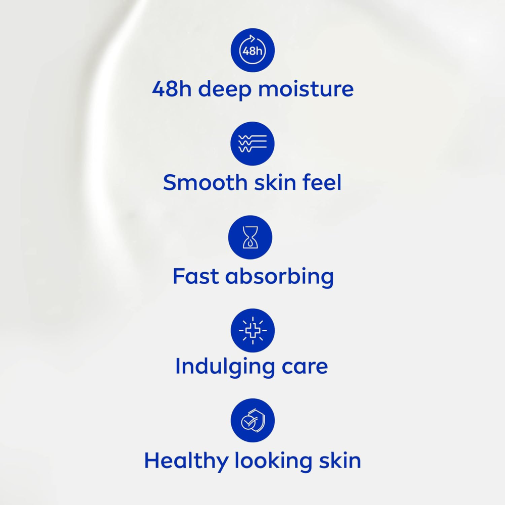 NIVEA SMOOTH SENSATION BODY LOTION 250ML Infused with a deep moisture serum to combat dryness, this lotion is enriched with shea butter for intense nourishment. It delivers luxurious moisture care for up to 48 hours, leaving your skin soft, supple, and comfortable. Ideal for dry skin and dermatologically tested for compatibility.