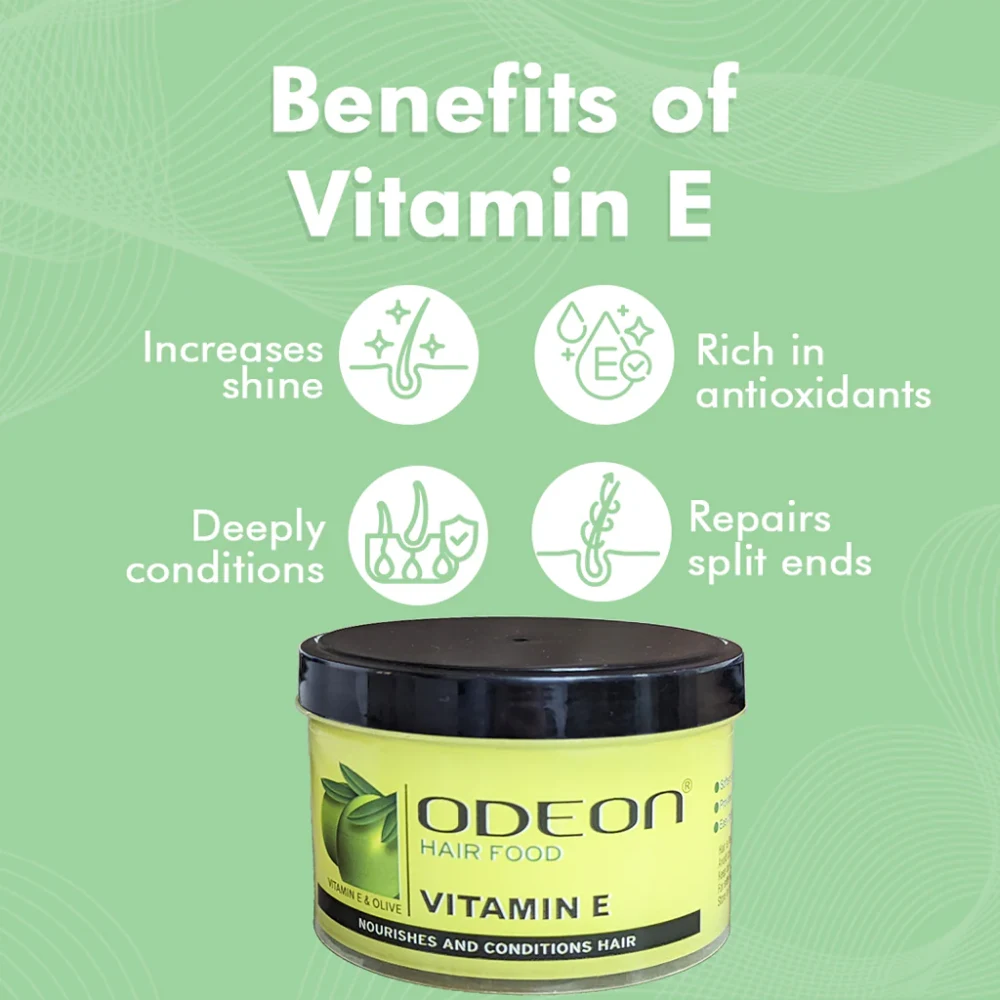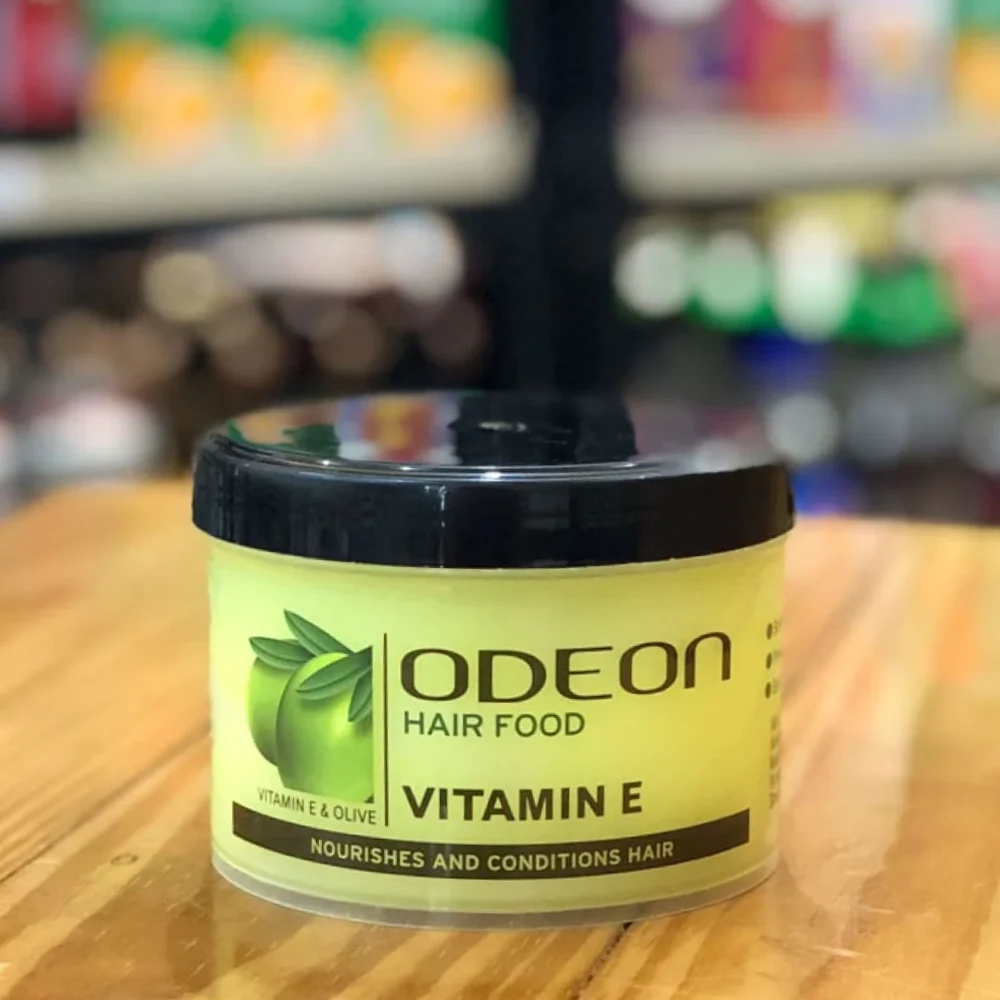 ODEON HAIR FOOD VITAMIN E & OLIVE NOURISHES AND CONDITIONS HAIR 210 G Nourishing Formula: Infused with Vitamin E and olive oil, it helps to deeply nourish and condition hair, promoting softness and shine. Hydration: Provides essential moisture to dry and damaged hair, helping to restore its natural luster. Strengthens Hair: Regular use can help strengthen hair, reducing breakage and improving overall health. Usage: Application: Take a generous amount of the hair food and apply it evenly to damp or dry hair, focusing on the ends. You can leave it in for a few hours or overnight for deeper conditioning. Rinse or Leave-In: Depending on your preference, you can either rinse it out after a set time or leave it in for continuous nourishment. Size: The 210 g packaging is convenient for regular use, offering plenty of product to keep your hair healthy and well-nourished. Ideal For: Those with dry, damaged, or frizzy hair seeking a deep conditioning treatment.