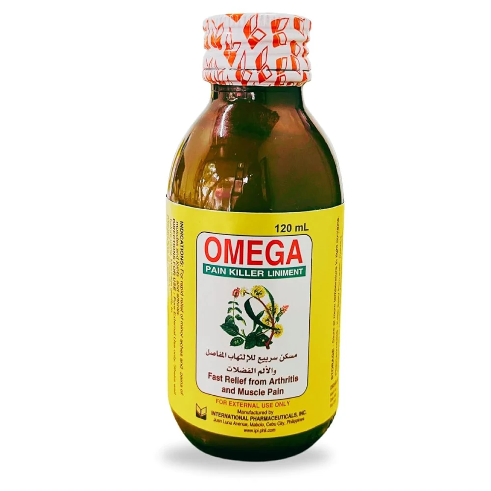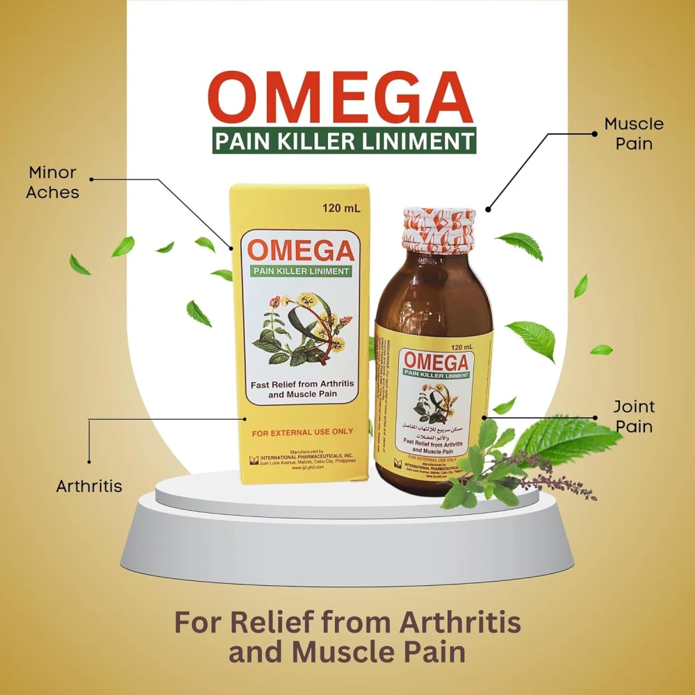 OMEGA PAIN KILLER LINIMENT FOR FAST RELIEF FROM ARTHRITIS AND MUSCLE PAIN 120 ML Targeted Relief: Specifically formulated to alleviate pain associated with arthritis and muscle soreness. Fast-Acting: Provides quick relief, helping to soothe discomfort effectively. Arthritis Pain: Helps reduce inflammation and discomfort in joints affected by arthritis. Muscle Pain: Effective for relieving aches from overexertion, strains, and general muscle fatigue. Sports Injuries: Can be used to help manage pain from sports-related injuries. Topical Use: Apply a sufficient amount to the affected area. Massage: Rub gently into the skin until absorbed. Frequency: Use as needed, generally several times a day for best results. Avoid Contact with Eyes: Do not apply near the eyes or on sensitive areas. Patch Test: Conduct a patch test first if you have sensitive skin or allergies. Not for Open Wounds: Avoid applying to broken or irritated skin. Generous Size: The 120 ml bottle provides ample product for regular use.