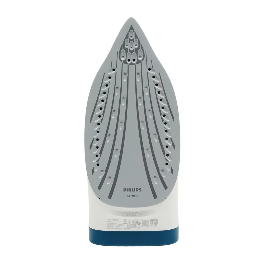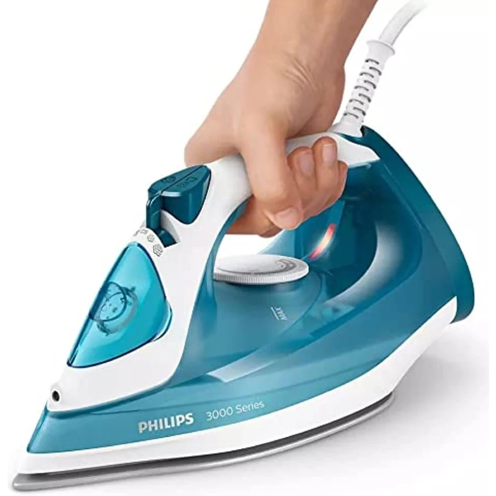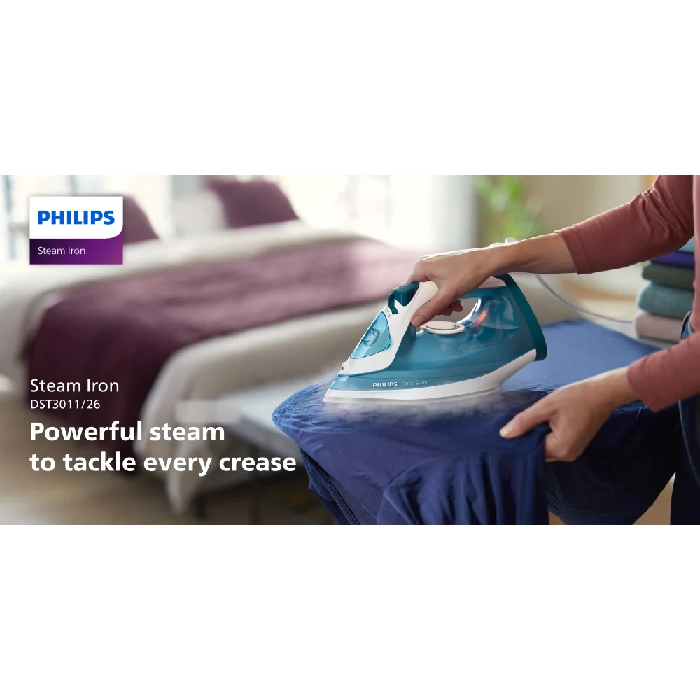 PHILIPS DST3011 3000 SERIES STEAM IRON 2100 W Powerful 2100 Watts: Ensures quick heating and strong steam output for effective wrinkle removal. Continuous Steam Output: Delivers 30g/min of continuous steam, which helps to smooth out wrinkles and reduce ironing time. Drip Stop Feature: Prevents water from leaking, ensuring no stains on your clothes while ironing, even at low temperatures. 300 ML Water Tank: A large tank capacity allows for longer ironing sessions without the need for frequent refills. Ceramic Soleplate: The smooth ceramic soleplate glides effortlessly over fabrics, providing even heat distribution and reducing the risk of sticking. Vertical Steaming Capability: Ideal for steaming hanging garments or curtains, adding versatility to your ironing tasks. Benefits: Efficient Wrinkle Removal: The combination of continuous steam and high wattage allows for quick and effective ironing, suitable for various fabric types.