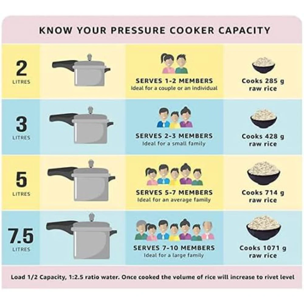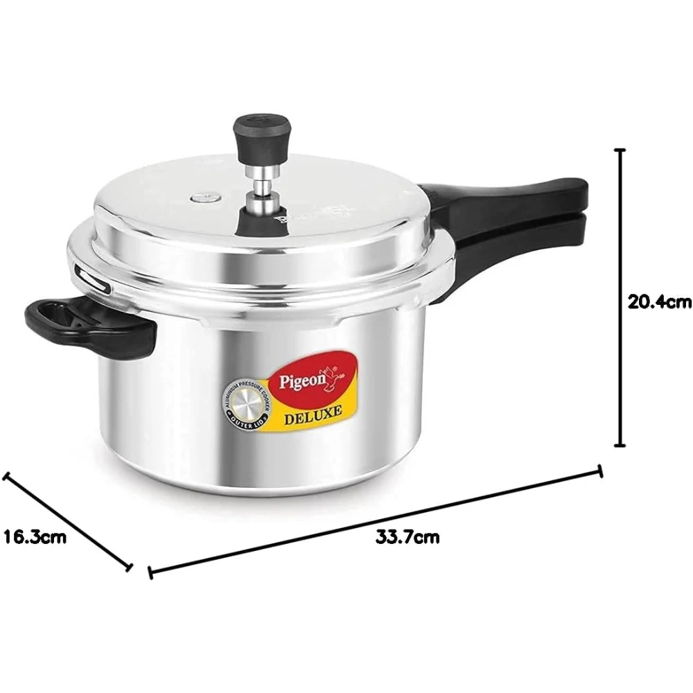 PIGEON DELUXE ALUMINIUM PRESSURE COOKER 3 L The Pigeon Deluxe Aluminium Pressure Cooker (3 L) is a compact and efficient kitchen essential, perfect for smaller households or for cooking side dishes. Here are some key features and details: Features Capacity: The 3-liter capacity is ideal for small families or for preparing quick meals. Material: Made from high-quality aluminum, which ensures even heat distribution and quick cooking. Safety Features: Typically includes a safety valve and sturdy handles for secure operation. Lightweight: Aluminium construction makes it easy to handle, even when filled. Easy to Clean: The smooth surface allows for easy cleaning and maintenance. Benefits Time-Saving: Reduces cooking time significantly compared to traditional cooking methods. Energy Efficient: Cooks food quickly, helping to save on energy costs. Versatile Cooking: Suitable for cooking rice, lentils, vegetables, and various other dishes.