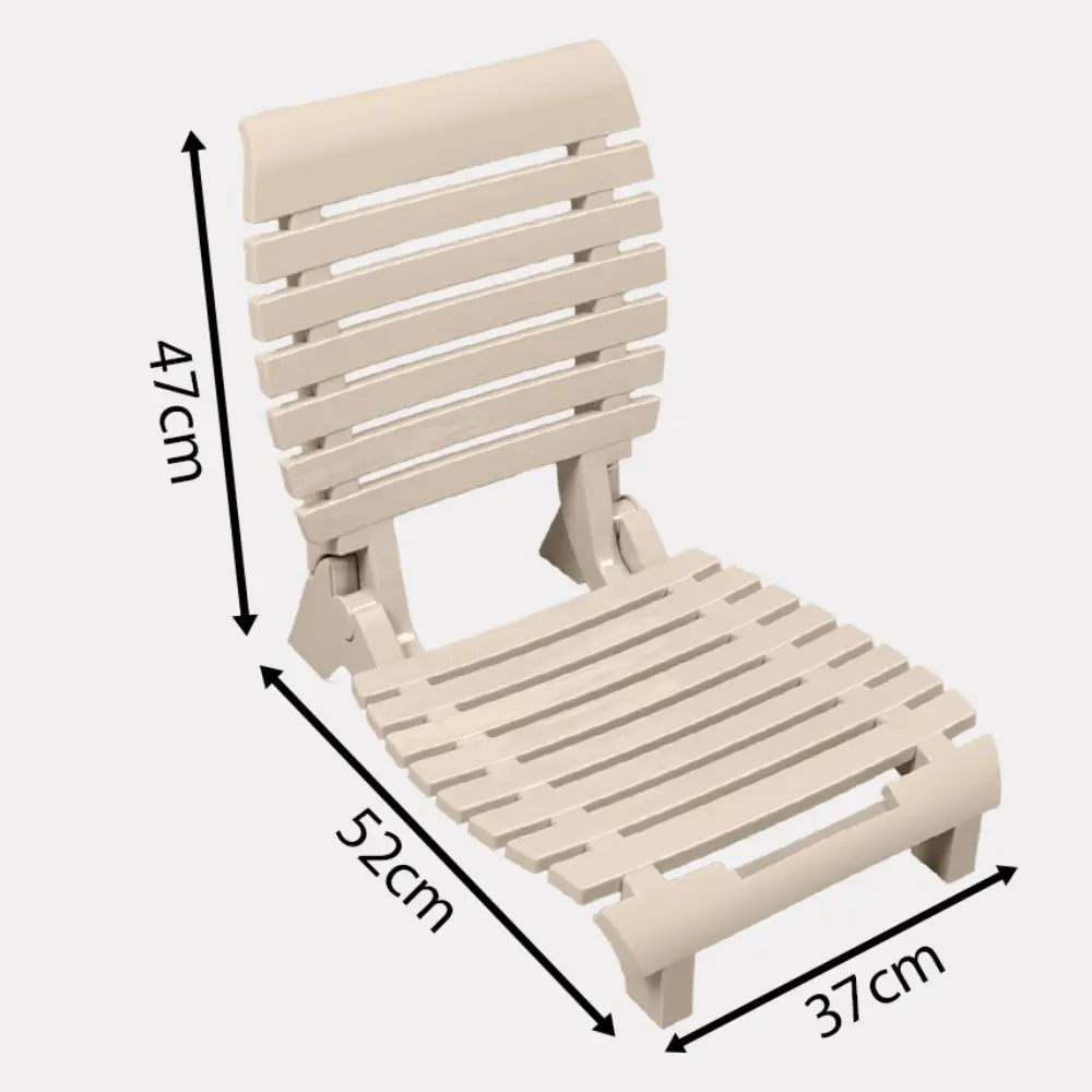 PLASTICNA BEACH FOLDING CHAIR I-CH-520F-BEG - BEIGE Material: Likely made of durable plastic or resin, making it resistant to the elements such as moisture and saltwater, which is ideal for beach environments. Foldable: Easy to fold for convenient transport and storage. Size: The dimensions you provided (47 cm width x 52 cm depth x 37 cm height) indicate it is a relatively small and portable chair, comfortable for casual sitting but not oversized. Width (47 cm): The width provides a moderate sitting space. Depth (52 cm): Depth ensures comfort for the legs when seated. Height (37 cm): Likely refers to the seat height, suggesting a low-sitting position typical for a beach chair. Usage: Great for beach outings, picnics, or outdoor events where portability and ease of use are priorities. Designed to withstand exposure to sand, saltwater, and sun, it is likely to have UV-resistant materials to prevent fading and cracking.