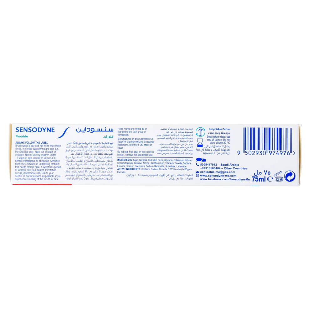 SENSODYNE F TOOTH PASTE FOR DAILY SENSITIVITY PROTECTION, STRONG TEETH AND HELATHY GUMS 75 ML Sensodyne F Toothpaste for Daily Sensitivity Protection (75 ml) is specially formulated for those with sensitive teeth. Here are some key features: Key Features: Daily Sensitivity Protection: Provides effective relief for sensitivity, allowing you to enjoy your favorite foods without discomfort. Strengthens Enamel: Helps to strengthen teeth and protect against cavities. Promotes Healthy Gums: Formulated to support gum health and reduce the risk of gum issues. Fluoride Formula: Contains fluoride for added cavity protection. Fresh Taste: Leaves your mouth feeling clean and fresh after brushing.