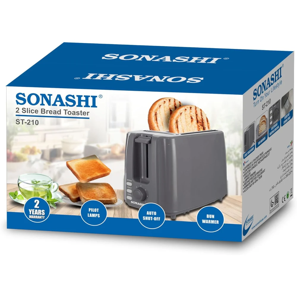 SONASHI 2 SLICE BREAD TOASTER ST210 The Sonashi 2-Slice Bread Toaster (ST210) is a compact and efficient kitchen appliance designed for toasting bread and more. Here’s an overview of its features, benefits, and usage tips: Key Features 2-Slice Capacity: Designed to toast two slices of bread at once, making it ideal for small households or quick breakfasts. Adjustable Browning Control: Features a dial to select your desired toast level, from light to dark. Compact Design: Space-saving size, perfect for small kitchens, dorms, or countertops. Wide Slots: Accommodates various types of bread, including thick slices, bagels, and English muffins. Safety Features: Often includes automatic shut-off and anti-jam mechanisms for safe operation. Benefits Quick and Convenient: Prepares breakfast in minutes, allowing you to enjoy perfectly toasted bread with minimal effort. Versatile Use: Suitable for toasting not just bread but also pastries, waffles, and other breakfast items.