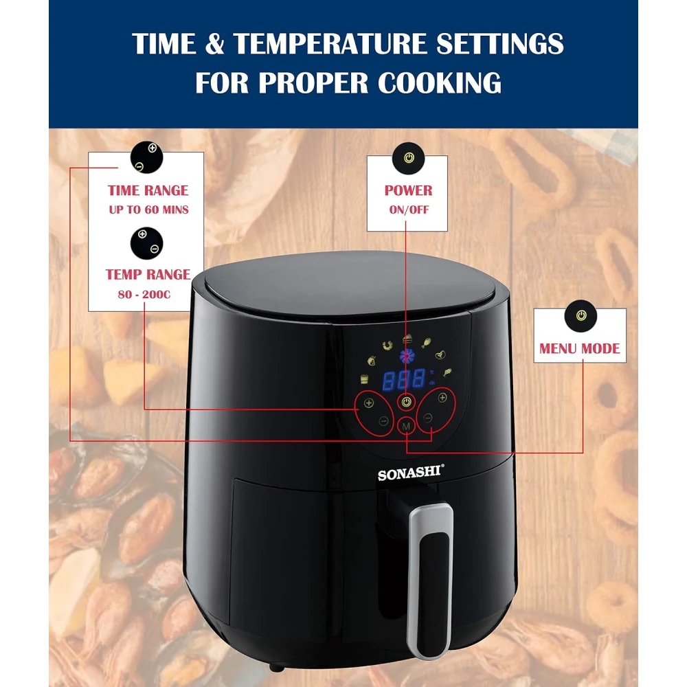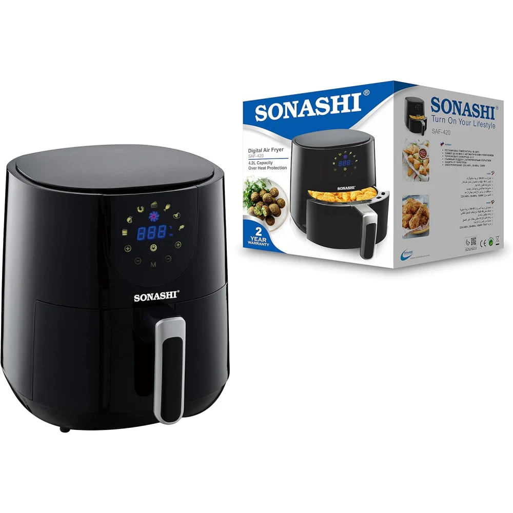 SONASHI AIR FRYER SAF420 The Sonashi Air Fryer (model SAF420) is designed to provide healthier cooking options with convenient features. Here are some key highlights: Rapid Air Circulation: Utilizes hot air circulation technology to cook food evenly and achieve a crispy texture with minimal oil. Adjustable Temperature Control: Allows you to set the desired temperature for different types of food, ensuring optimal cooking results. Timer Function: Typically includes a built-in timer for precise cooking, helping to prevent overcooking. Large Capacity: Suitable for preparing meals for families or gatherings, making it a versatile kitchen appliance. Non-Stick Basket: Features a non-stick cooking basket for easy food release and quick cleanup. Safety Features: Often equipped with cool-touch handles and an automatic shut-off function for safe operation.