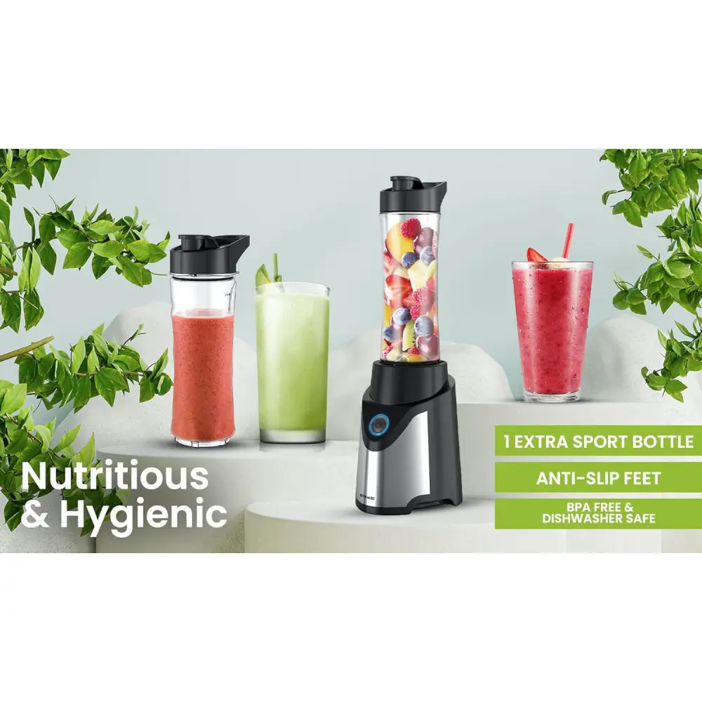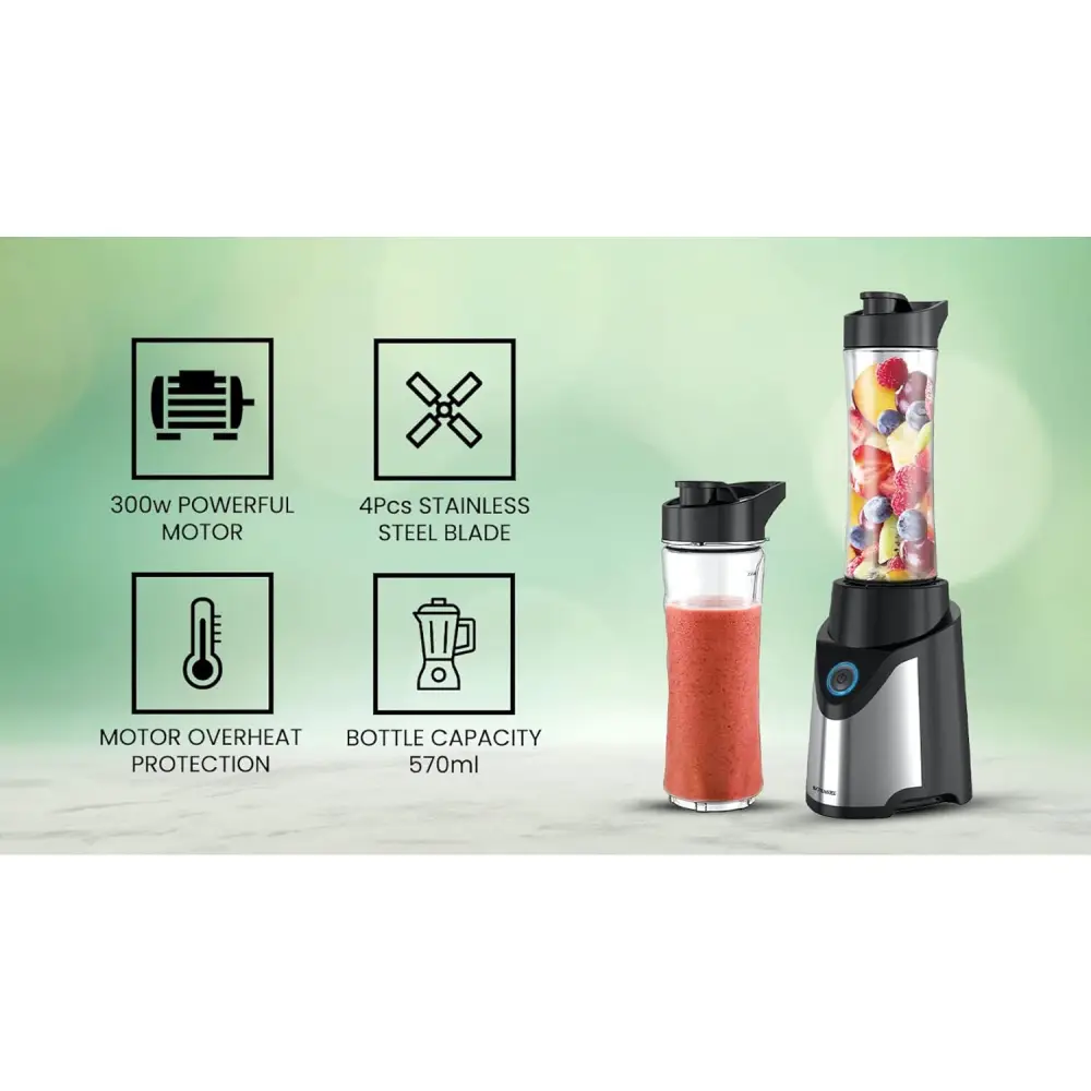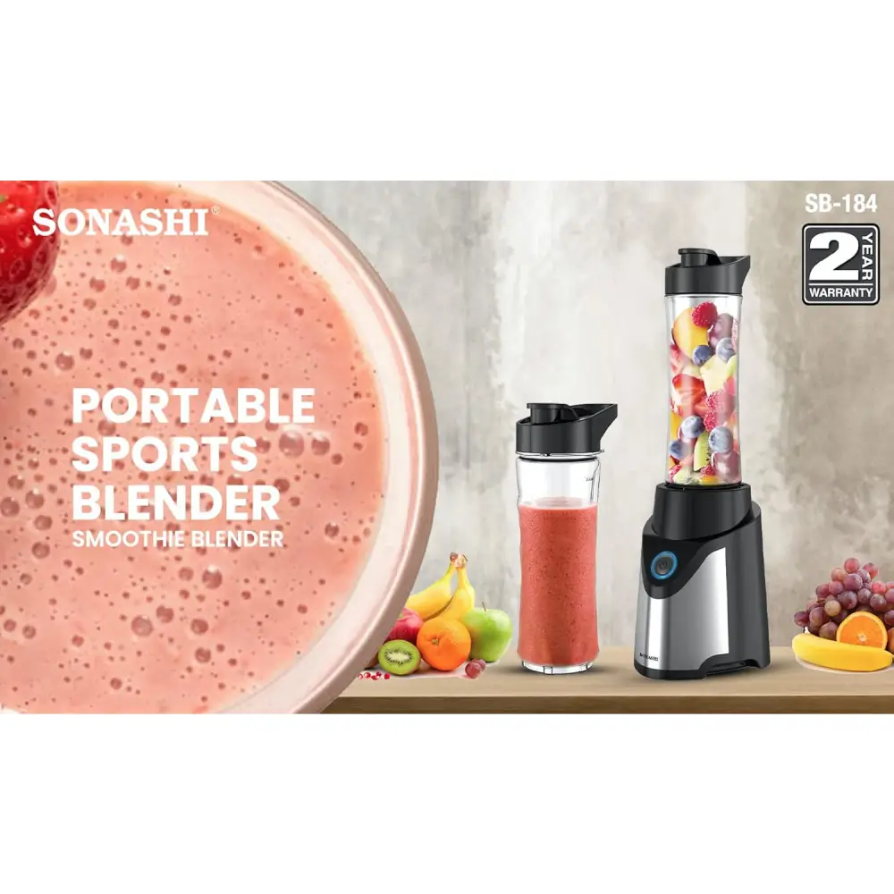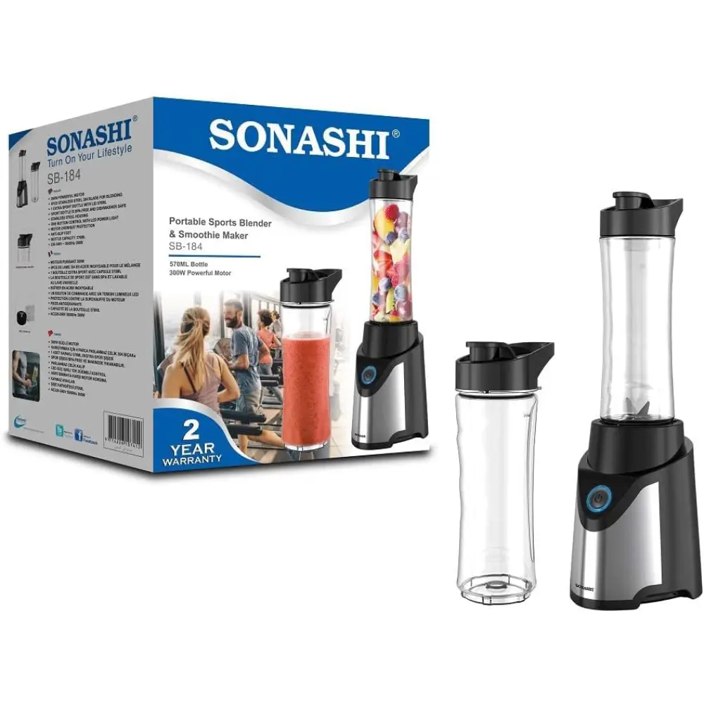 SONASHI BLENDER SB-184 Portable Smoothie Blender: Blend healthy and tasty drinks within minutes with the help of Sonashi Sports blender. It features one-button control with led power light that makes it easy to operate. Superior Grinding: This sport drink blender is equipped with a 304 stainless steel blade that can easily cut through ice and frozen fruits. It is easy to clean and suitable for making smoothies, shakes, soups, salad dressing, and much more. Useful Accessories: The slim-design blender includes two large 570 ml jars that double up as a sport mixer blender bottle. Now you can blend and drink in the same container. Each bottle is BPA-free and dishwasher safe. Safety Measures: This blender for shakes and smoothies is equipped with anti-slip feet that keep it sturdy while the motor is powered. The inbuilt overheat protection mechanism ensures the longevity of its powerful motor and saves the hassle of frequent repair. Sonashi kitchen blender is powered by a robust 300W motor