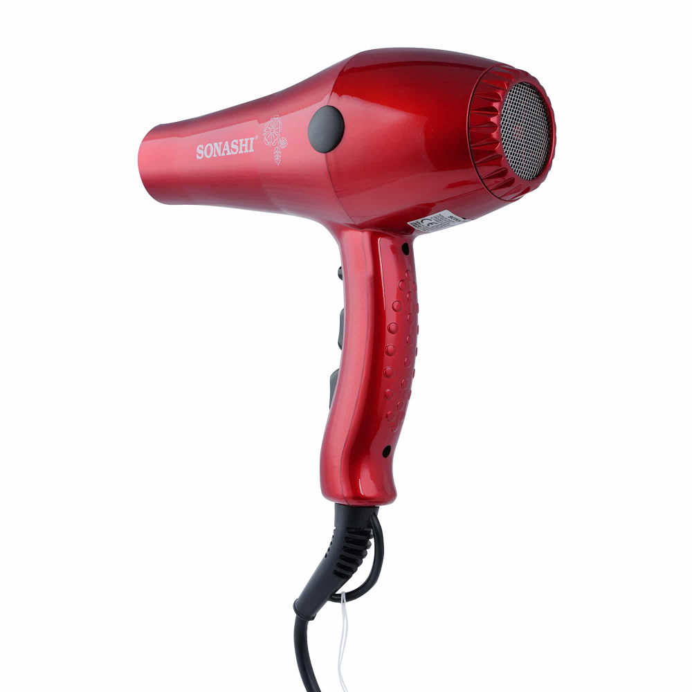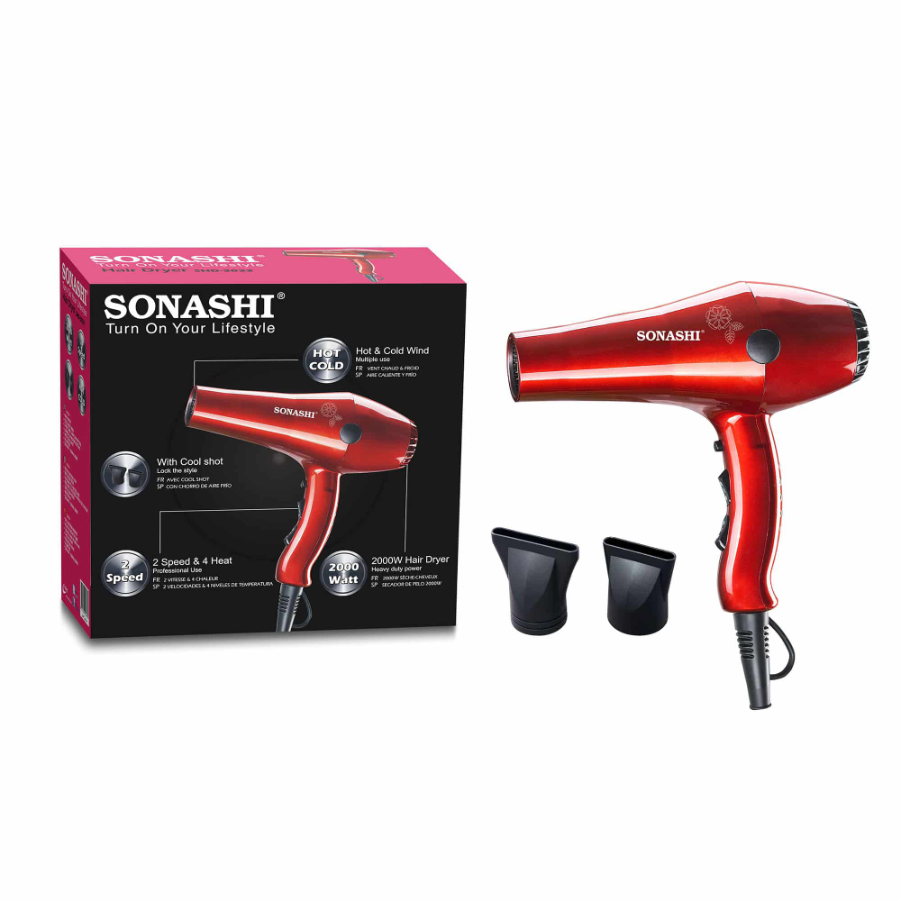SONASHI HAIR DRYER SHD-3032 PROFESSIONAL HAIR DRYER Experience salon-quality hair drying in the comfort of your home with the SONASHI cool shot hair dryer. Perfect for styling without compromising hair health, this dryer helps you achieve stunning hairstyles in no time. NO HAIR DAMAGE The 2000W hair dryer is engineered to deliver optimal airflow for gentle drying. Its high-performance design minimizes damage to your hair and scalp while helping retain moisture. 2 SPEED AND HEAT SETTINGS Equipped with 2 heat settings and 2 speed options, this hot and cold air dryer ensures uniform heat distribution and ample airflow for a superior blow-drying experience. The AC motor protects your hair from heat damage, leaving you with lustrous, frizz-free locks. ERGONOMIC DESIGN With an ergonomic and lightweight design, this hair dryer is perfect for frequent travelers, allowing you to style your hair effortlessly on the go.