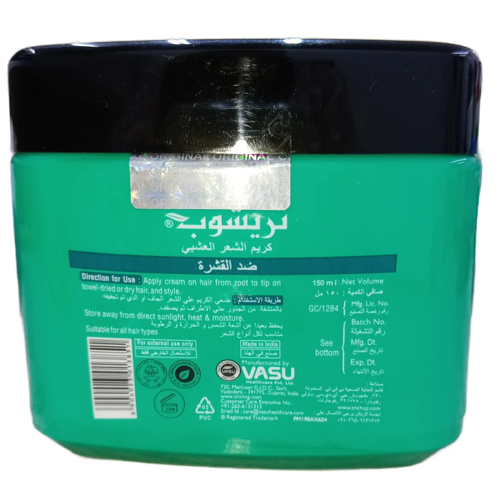 TRICHUP ANTI-DANDRUFF HELPS ELIMINATE DANDRUFF HERBAL HAIR CREAM 150 ML Dandruff Elimination: Specifically designed to target and reduce dandruff, helping to maintain a flake-free scalp. Herbal Ingredients: Enriched with natural herbal extracts that soothe the scalp and promote overall hair health. Nourishing Formula: Provides essential moisture and nourishment, making hair softer and more manageable. Usage: Application: Take a small amount of the cream, rub it between your palms, and apply it evenly to your hair and scalp. Massage gently for better absorption. Regular Use: For best results, use it regularly as part of your hair care routine to help maintain a healthy scalp. Size: The 150 ml packaging is practical for both home use and travel, allowing you to keep your hair and scalp in good condition wherever you go. Individuals struggling with dandruff and looking for a herbal solution to maintain scalp health. Suitable for all hair types, making it a versatile option for various hair care needs