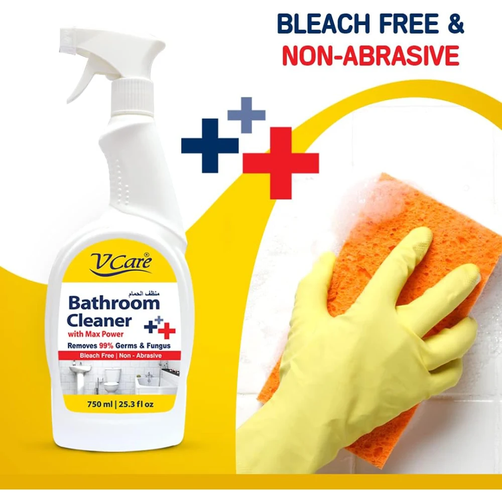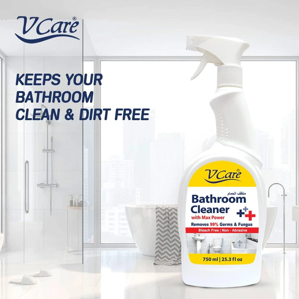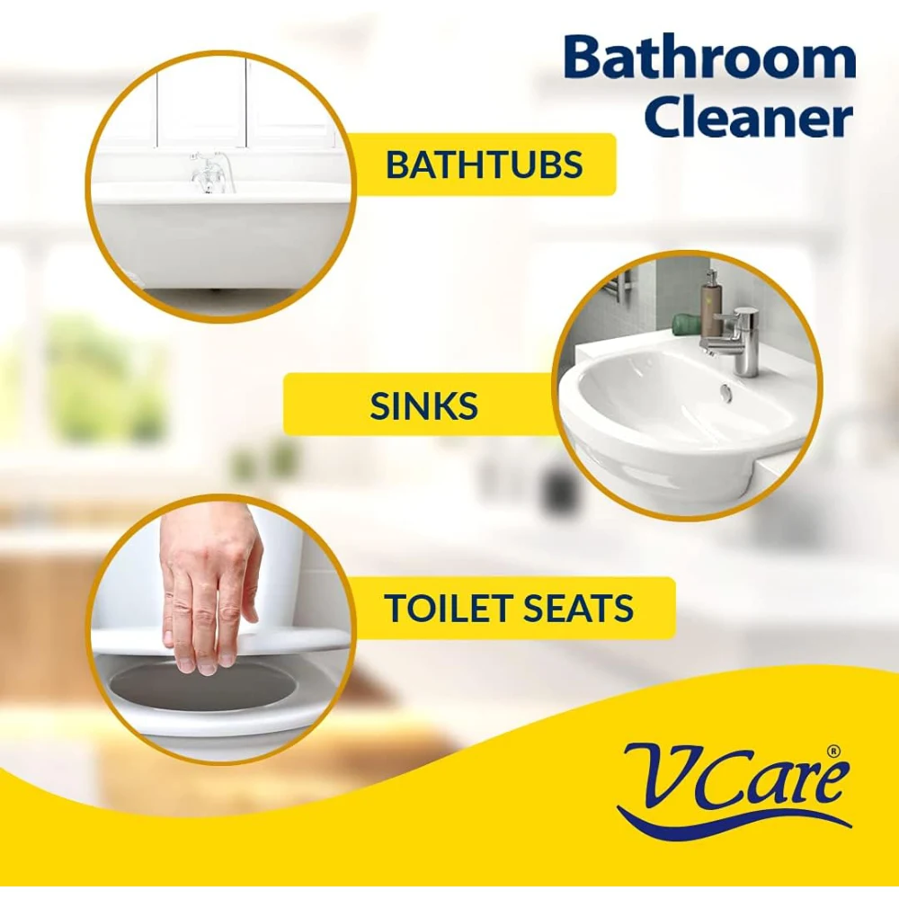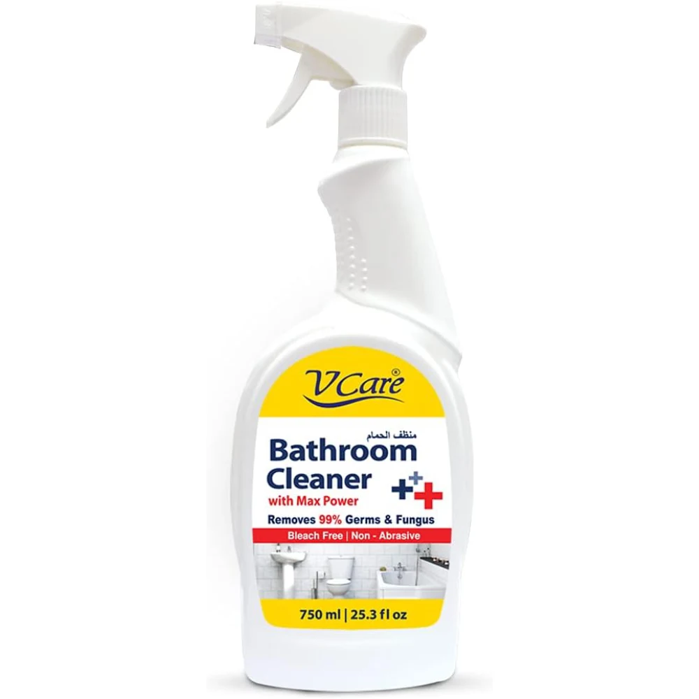 V CARE MAX POWER REMOVES 99% GERMS & FUNGUS BATHROOM CLEANER V Care Max Power Bathroom Cleaner is designed to effectively remove germs and fungi, ensuring a hygienic environment in your bathroom. Key Features: 99% Germ and Fungus Removal: Targets and eliminates a wide range of germs and fungi for a cleaner bathroom. Powerful Cleaning Action: Formulated to tackle tough stains, soap scum, and mildew. Multipurpose Use: Suitable for various surfaces, including tiles, sinks, bathtubs, and toilets. Usage: Apply: Spray directly onto the surface to be cleaned. Let It Sit: Allow the cleaner to penetrate for a few minutes for effective action. Scrub: Use a cloth or sponge to scrub the surface thoroughly. Rinse: Rinse the area with water to remove any residue. Safety Precautions: Keep out of reach of children. Avoid contact with eyes and skin; if contact occurs, rinse thoroughly. Use in a well-ventilated area.