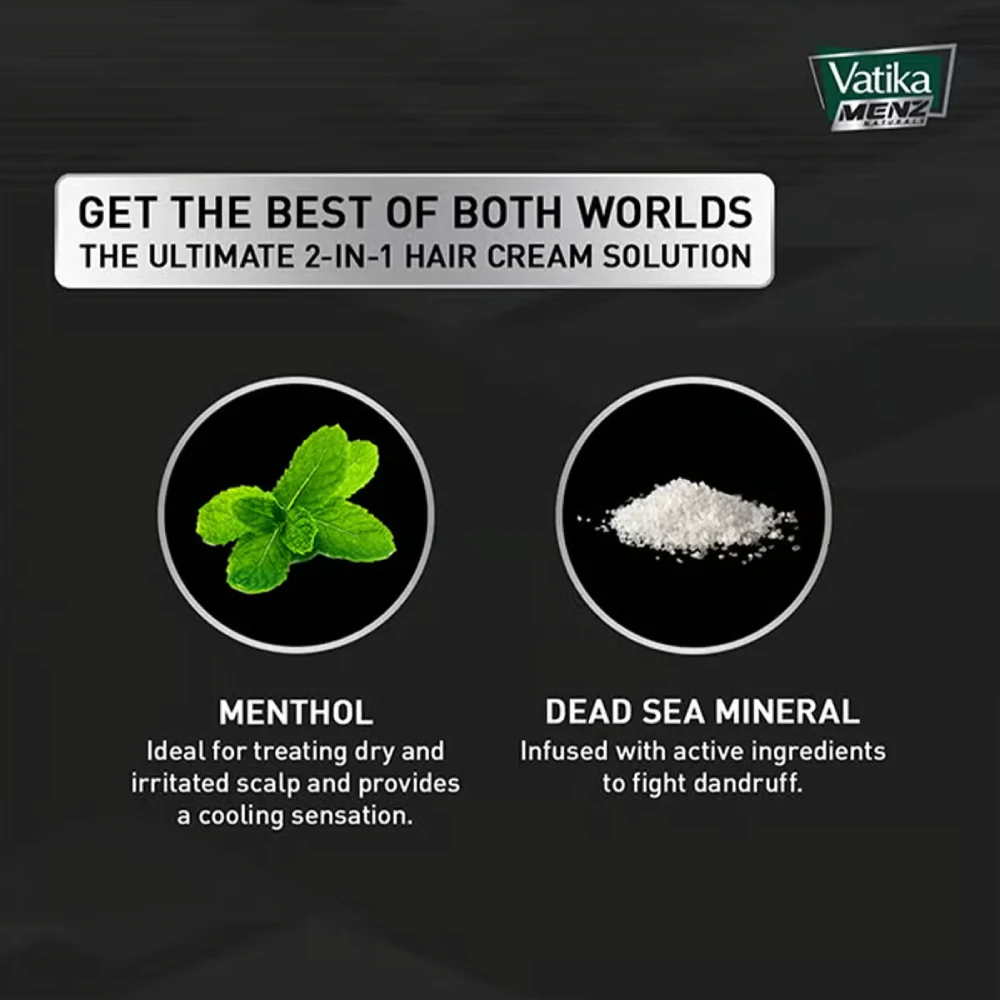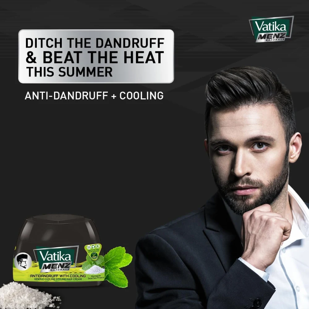 VATIKA MENZ NATURALS ANTIDANDRUFF WITH COOLING GENTLE COOLING STYLING HAIR CREAM 140 ML Vatika Menz Naturals Anti-Dandruff Hair Cream is specially formulated to tackle dandruff while providing styling benefits and a refreshing feel. Key Benefits: Anti-Dandruff Formula: Designed to effectively reduce dandruff, helping to keep your scalp clean and flake-free. Cooling Effect: Contains ingredients that provide a gentle cooling sensation, soothing the scalp and making it comfortable to use. Styling Control: Offers a light to medium hold, allowing you to style your hair while keeping it looking natural and polished. Application: Apply a small amount of cream to your palms, rub them together, and work it through damp or dry hair. Style as desired for a fresh look. Daily Use: Suitable for everyday styling, helping to maintain your hairstyle while caring for your scalp. The 140 ml packaging is convenient for daily use and travel, ensuring you can keep your hair looking great