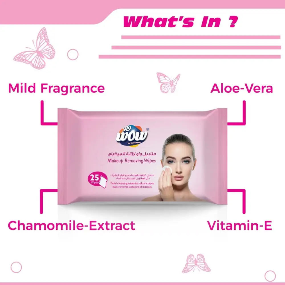 WOW FACIAL MAKEUP REMOVING WIPES FOR ALL SKIN TYPES - 25 WIPES Effective Makeup Removal: Gently removes all makeup, including waterproof mascara. Mild Fragrance: Light and refreshing scent that won't overwhelm the senses. Enriched with Skin-Loving Ingredients: Infused with Aloe, Chamomile Extract, and Vitamin E for hydration and soothing properties. pH Balanced: Designed to maintain your skin’s natural balance. Alcohol-Free & Paraben-Free: Safe for sensitive skin, providing a gentle clean without harsh chemicals.